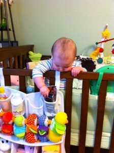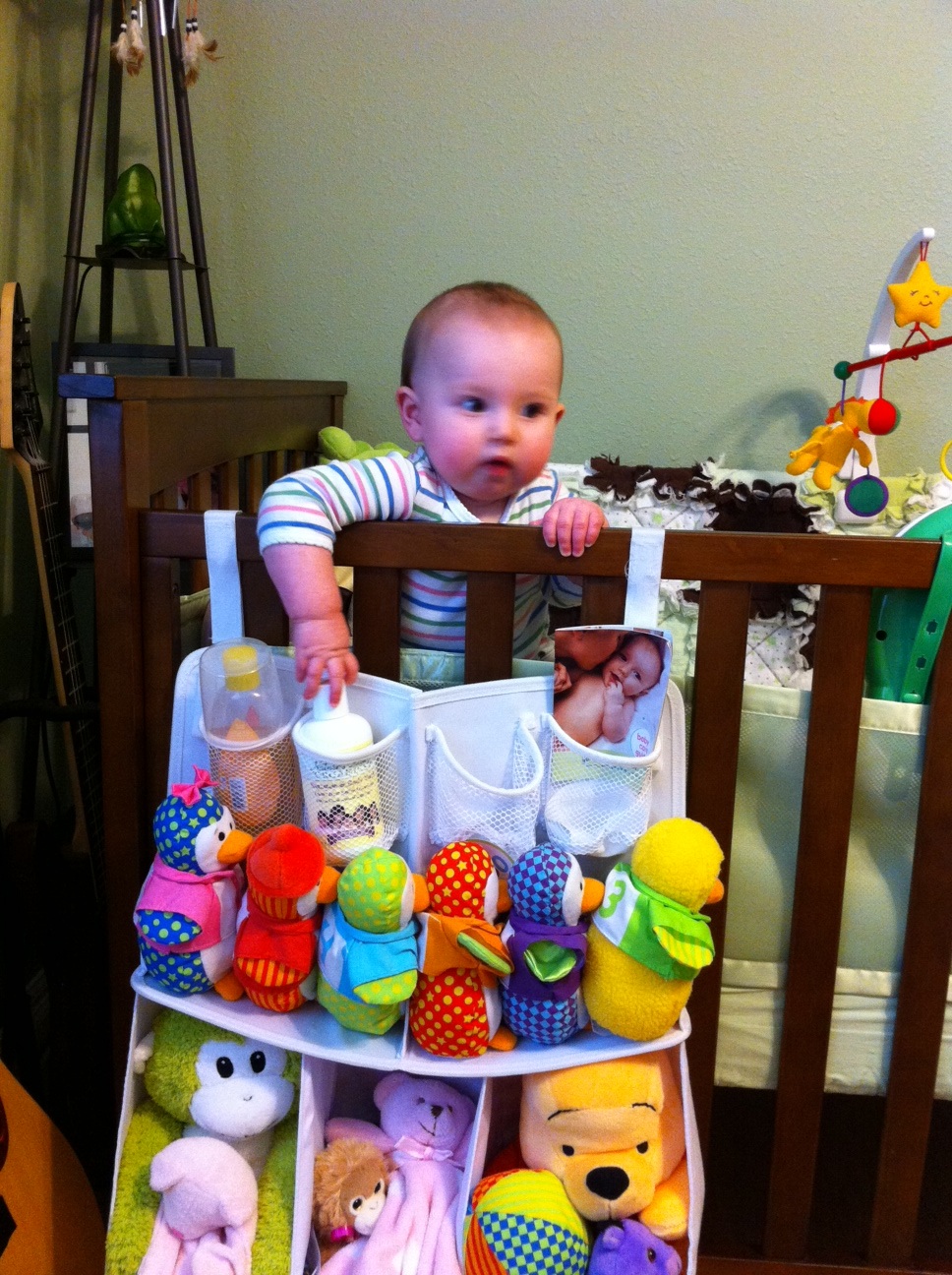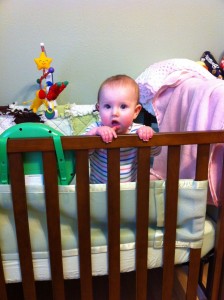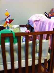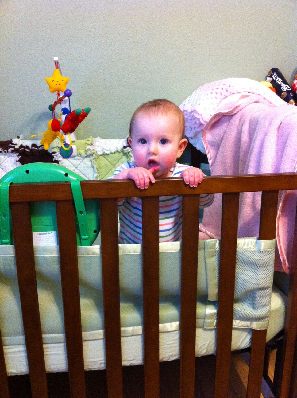 I wanted to get some cleaning done last night too, so while R napped in the living room I toted D around in the bedrooms with me. After almost scooting off our bed backwards while we were in there, I figured the confinement of her crib would be a better spot for her when we moved into her room. That way she couldn’t scoot out the door and escape on me either. 😉 She is rarely in her crib besides to sleep, so she was having a ball scooting around and playing with her toys and blankets in there. Look what she discovered she can do now, too: