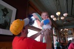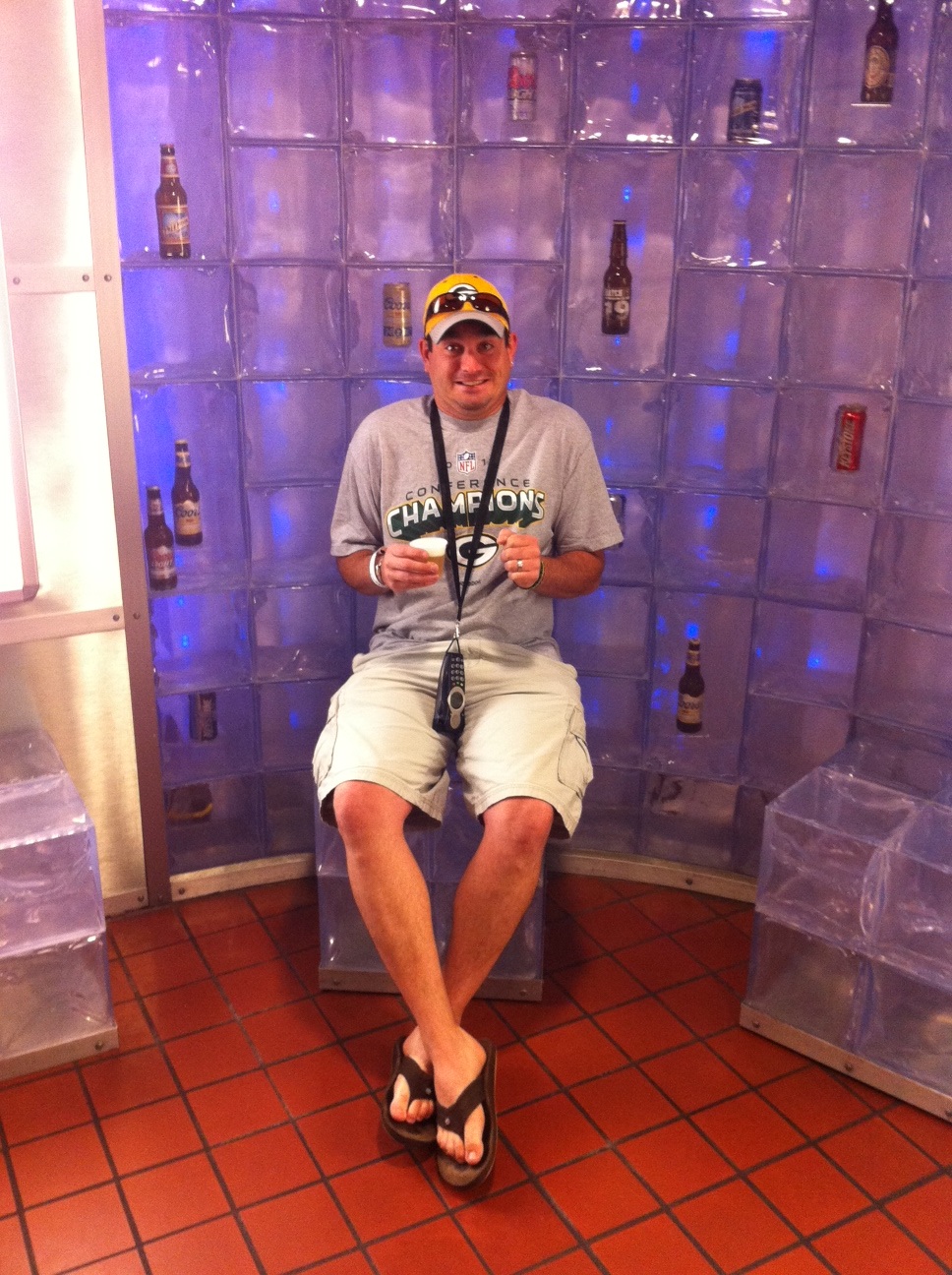 R pretending he's freezing on an "ice cube" chair at Coors