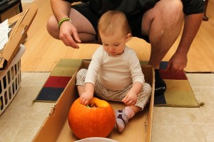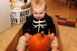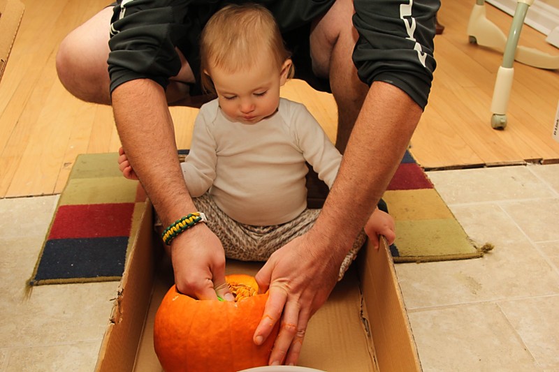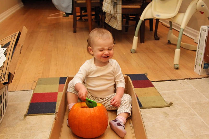 Didn’t they turn out great? It only took a couple hours to get them all finished because I had to give D a bath in the middle and then her incoming molar caused a scene at bedtime, but I’d say it was worth it. I did enjoy seeing D playing with her pumpkin this year, so that got me a little more in the Halloween spirit. And instead of real candles, this year we’re using little flickering pumpkin lights so we don’t have to worry about them constantly blowing out. Geniuses at work, I tell ya.
