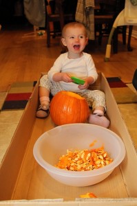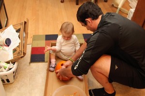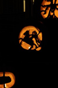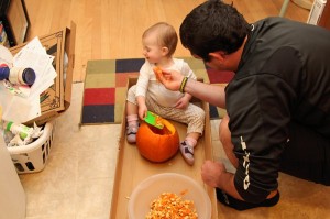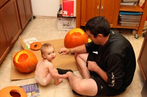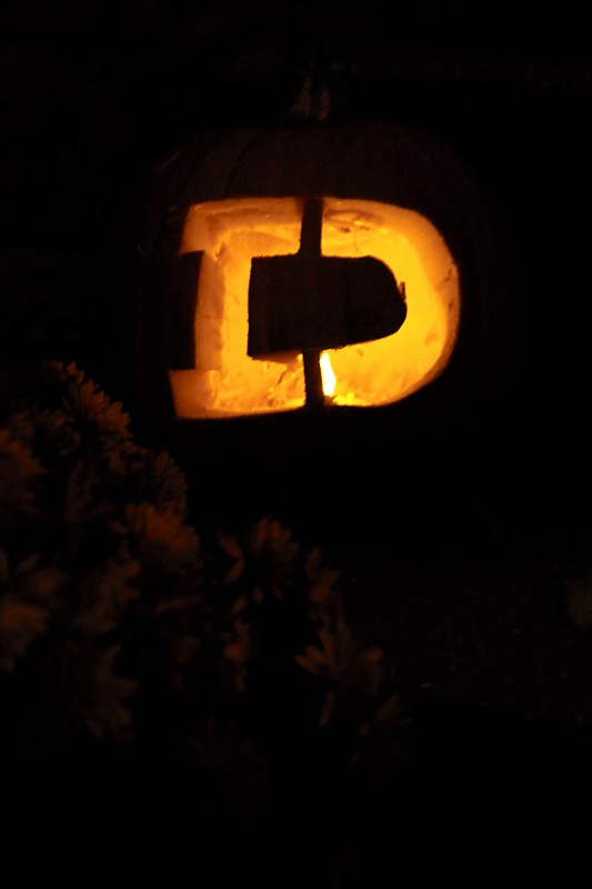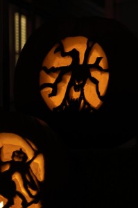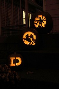Carving pumpkins has never been the highlight of my year either, as I hate grabbing through all the innards and usually just go with a traditional smiling jack-o-lantern face. This year, however, I decided to spice things up a bit with the carving. We had a couple carving kits leftover from years past that I busted out last night, and we now have some pretty sweet-looking pumpkins on our front steps. And no, I didn’t suddenly get all artistically talented or anything; they were stencils. R did do D’s free-hand, though. See, I told you he’s the creative one in this family.