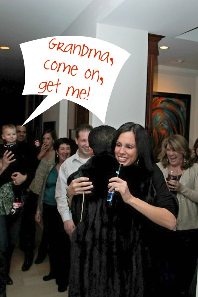 All of the guests were supposed to have congregated at their house by 6:45, as my mom, stepdad, and the couple with whom they were having dinner were planning on taking the train back to the suburbs from downtown Chicago and arriving home themselves by 7:15. Har! Yeah right. We didn’t get there until 9:00. And some people weren’t even able to come that night and had to miss the surprise and come down the next morning instead.