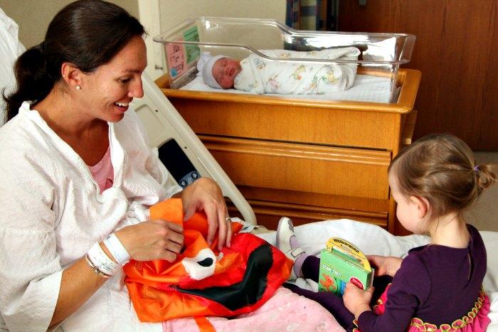 My mom and Ryan brought Della to the hospital to meet her new baby sister the next morning, and she has just been turning into the best big sister ever since that moment. She wanted to give the baby a kiss, which was the greatest thing I’ve ever seen. I think she was a little hesitant to come see me since I was sitting in the hospital bed, but she soon warmed up to everything in the room and was her usual funny little self. Plus I had gotten her an Elmo bag full of little books and crayons and stickers as a big sister present from Lana, so she was excited about that and had something to play with. So we were there until Tuesday evening, because due to the group B strep the pediatrician gave a 48 hour monitoring order for Lana to make sure she was ok. All signs pointed to perfectly healthy, so they actually let us go home an hour or two before the full 48 hour mark. I was definitely ready to get out of that room by that point. Trying to keep Della entertained in there was becoming kind of a chore. I had forgotten how easy it was when she was born since she was the only one to worry about.