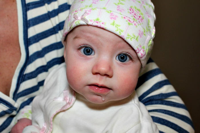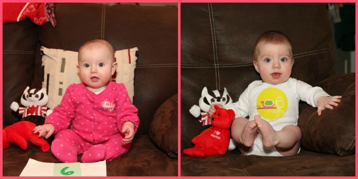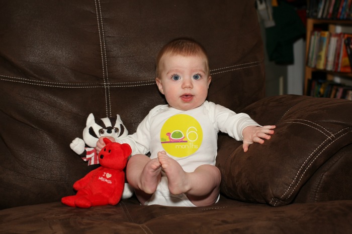 Some random fun facts from her sixth month of life – she wears size 2 diapers and is pretty much out of her size 3m clothes. There are still a couple shirts and pajama onesies that fit from the 3m era, but the vast majority of her clothes are now 6m or some 6-9m. She unfortunately has her first real illness, a case of croup. I had a feeling that’s what it was when she started having a harsh, hoarse cough Sunday morning, and the doctor confirmed it yesterday. I just hope her cough and congestion clear up soon, because the poor little thing sounds awful.