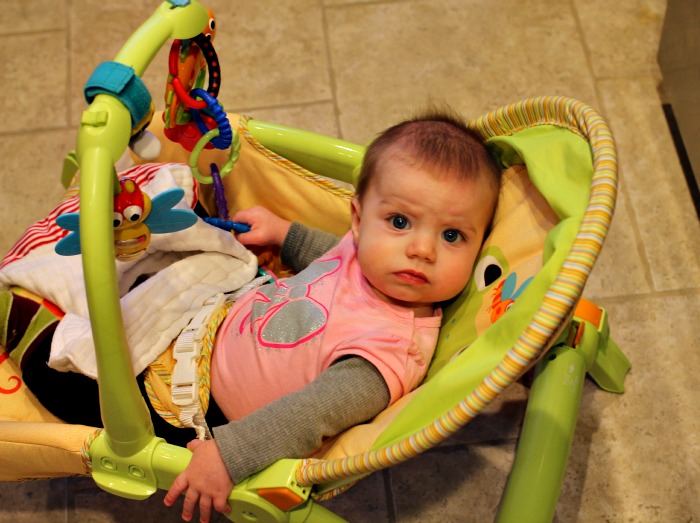 She absolutely loves the jumperoo. She can now spin the seat in different directions so she can see what else is on the tray. In particular, she loves looking at her reflection in the little whale shaped mirror with the bar and sliding rings above it. She will happily stay in there for long stretches of time, which is very helpful when I’m trying to get something done around the house or need to tend to Della. Unfortunately it usually bounces the poop right out of her, as it is not uncommon for her to be found sitting in a blowout by the end of her jump sessions.