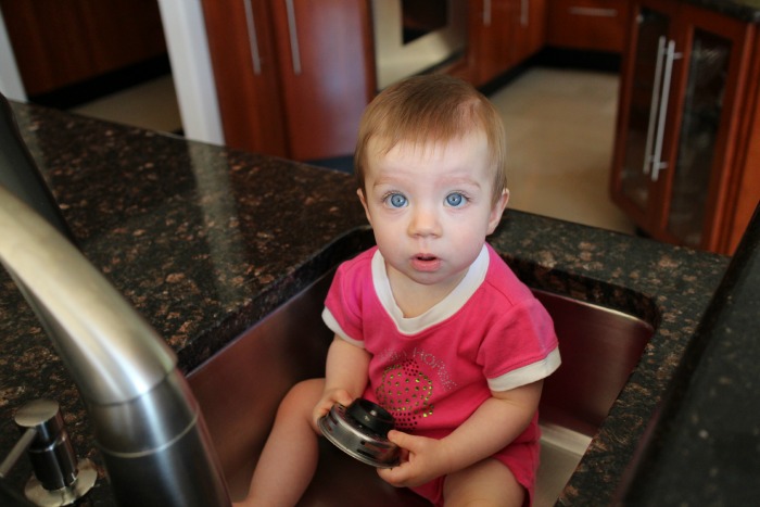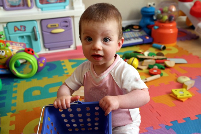 She also started pulling herself up on everything last week. She had begun doing this in her crib the week before so we had to lower her mattress, but I hadn’t seen her do it on the furniture too until almost a week ago. Now she does it like it’s second nature. And she’s very confident in this new found skill. A little too confident sometimes, and I’m constantly afraid she’s going to fall and crack her chin on every single thing.