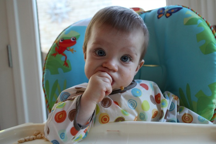 Eating. She’s a great little chow hound. She eats all solids for lunch and dinner, and yesterday the doctor said to start adding in some more food too. She had Cheerios for the first time yesterday as well, per the doctor’s ok, and she ate them with no problem at all. That’s good, because now I don’t have to worry about buying separate little puffs or anything for her. Cheerios for all.