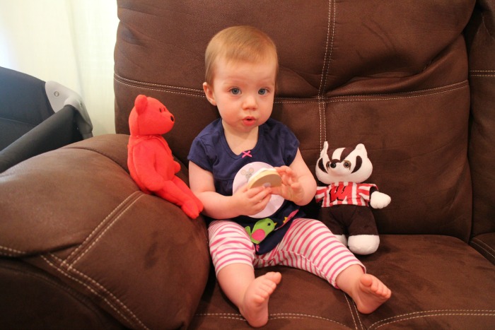 Not a whole ton of “words” yet, but still lots of sounds. “Do” is her big one (sounds like “doh”, not “doo”), and I’ve noticed she says it a lot when I tell her no. Maybe that’s what she’s trying to say, because she hears “no” often. The little stinker is a magnet for everything she shouldn’t have – outlets, DVDs off the shelf, books under the coffee table…