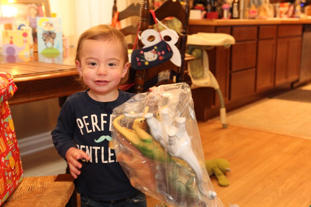 He loves Thomas and all the choo-choos, especially Percy. He adores his big sisters and would follow them to the ends of the earth. He still craves his plug, but we’re working on making that only for naps and nighttime (again!); he’s actually gotten very good about giving it to you when you ask for it or throwing it in his bed if you tell him to. His favorite snuggle toys are Ellie the elephant and a rag; any burp rag will do, even if it’s getting a little stinky. He likes to color, especially when the girls are working on their own art projects. He loves dinosaurs and has quite the collection going. Oddly enough, he also loves to play with little erasers with characters on them and has an entire bag full of them.