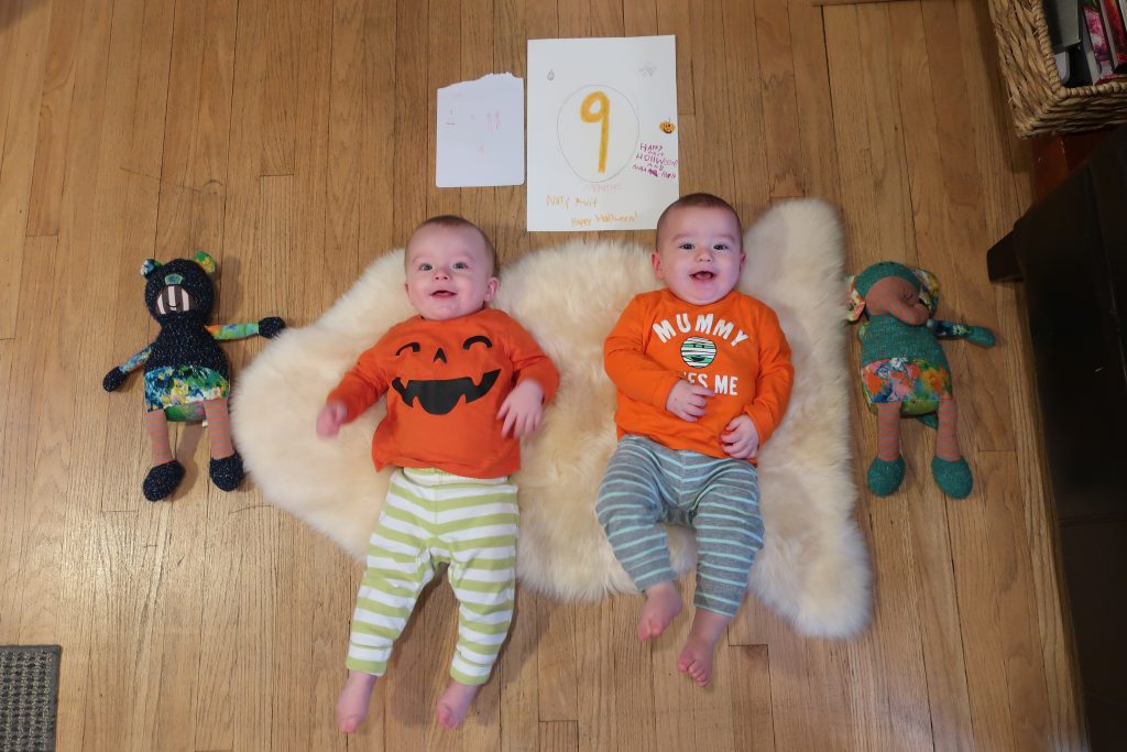 Ok, so a couple things here. Avit is obviously heavier than Nat when we pick them up, so it was fun to finally see by exactly how much. Also, Avit is definitely not taller than Nat – they were squirming around on the table when the nurse tried to stretch them out to measure height, so that is wrong. When they stand next to each other, Nat is clearly taller, and I even told the doctor those measurements are off. I was instructed to take their daily milk amount down from 30-32 oz. to 24 oz. (they still have 4 bottles of whole milk daily mixed in with their 3 meals of real food, so i’ve just knocked them down from 8 oz. to 6 oz. each). The doctor said this might help with Avit’s terrible dry skin and maybe even out their weights a little. Nat’s head still has its obvious flat spot on the back right side, but I read that kids’ heads have years to round out before they’re permanently fused. The pediatrician has never been worried about it or instructed us to do anything about it, so hopefully it will round. I can’t help but worry about it, but it hasn’t impeded his development at all so far.