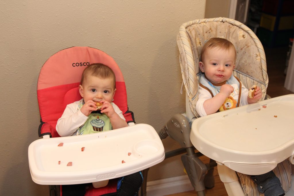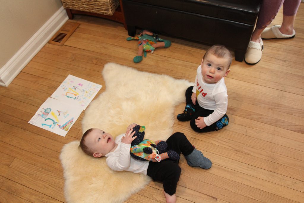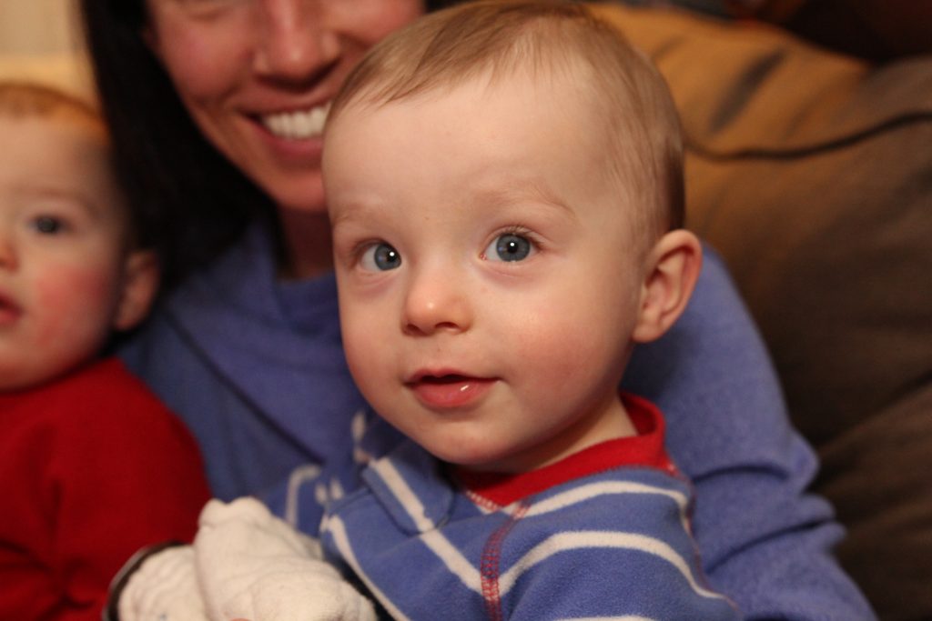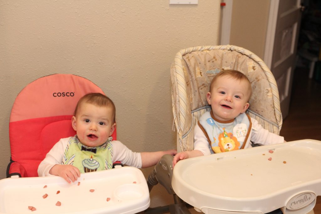 It’s still hard to believe that we have 2 one year olds in the house! These little guys are crazy, hilarious, adorable, and so full of love that I can’t stand it. They both chatter all day long. No real words yet – lots of da-das, ba-bas, little melodic songs, but of course no mama (the only time one of them even came close to something that sounded like mama was after they got their shots at the doctor last week, ha!) – and like I said with the others, I can’t wait to hear what they’re actually saying once they do talk. They both love to snuggle into you when they’re sad or sleepy, and sometimes they just come over, want to be picked up, and just be with you. They both bob up and down dancing; Nat claps; they wave; they play peek-a-boo; they love to blow spits and raspberries; they’re getting good at signing “all done,” “eat,” “milk,” and “more”; they play with their toys all day long; they wake up full of smiles in the morning eager to see you and give you hugs. I love them to pieces.