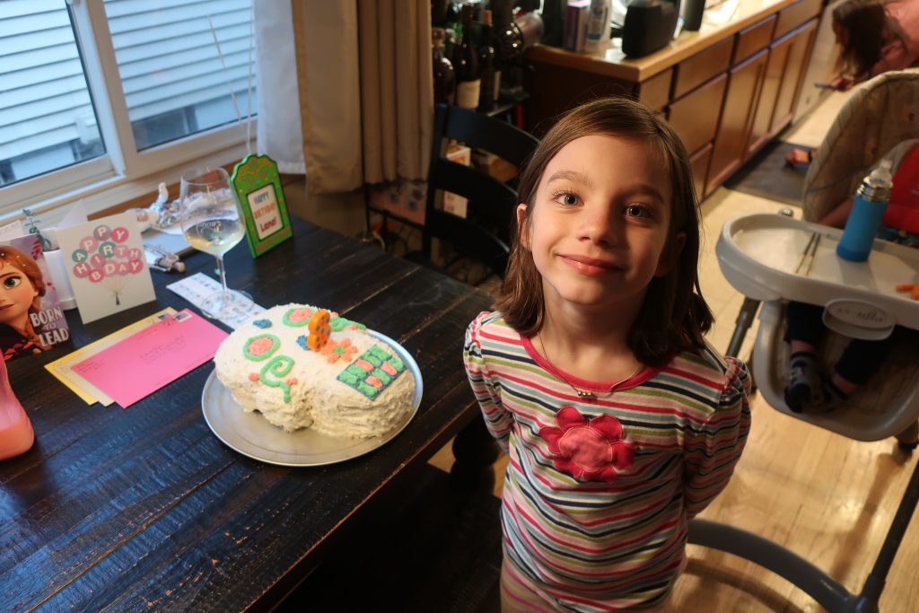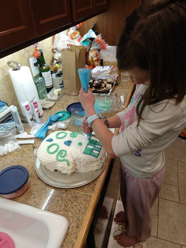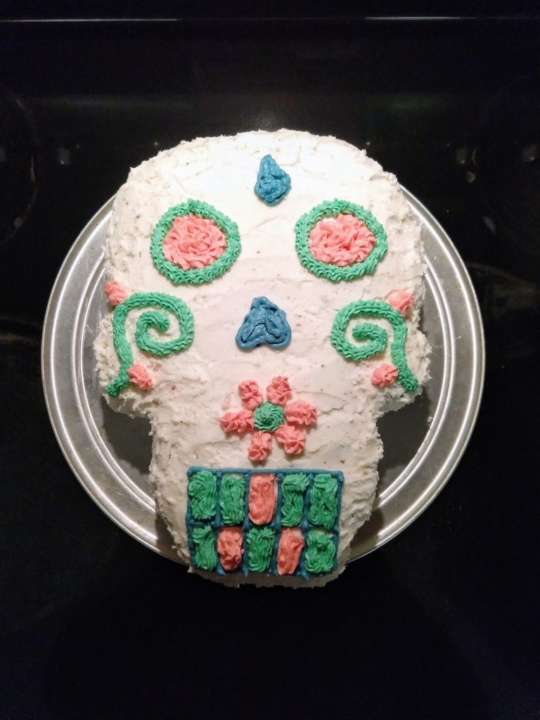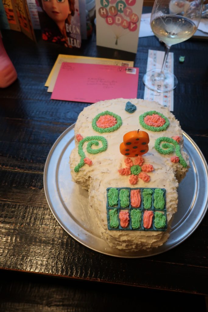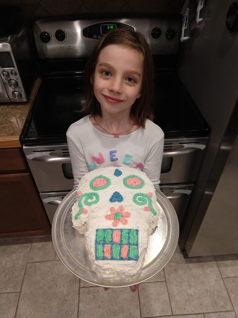A week or so earlier I’d asked what kind of cake she wanted for her birthday this year, and she requested marble. Little did I know that required combining 2 different batters, but I figured it out and it actually turned out pretty great. I made a double batch of buttercream frosting and it’s a good thing I did, because we ended up making it a double-decker cake and used every last bit. Lana came up with a dia de los muertos skull design and decoration scheme, and it turned out awesome! She helped crack the eggs, cut out the skull shape, and frost with the piping bags, and she was SO excited about it. It was delicious!