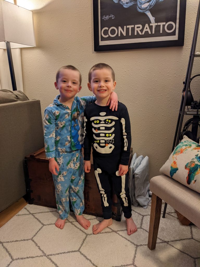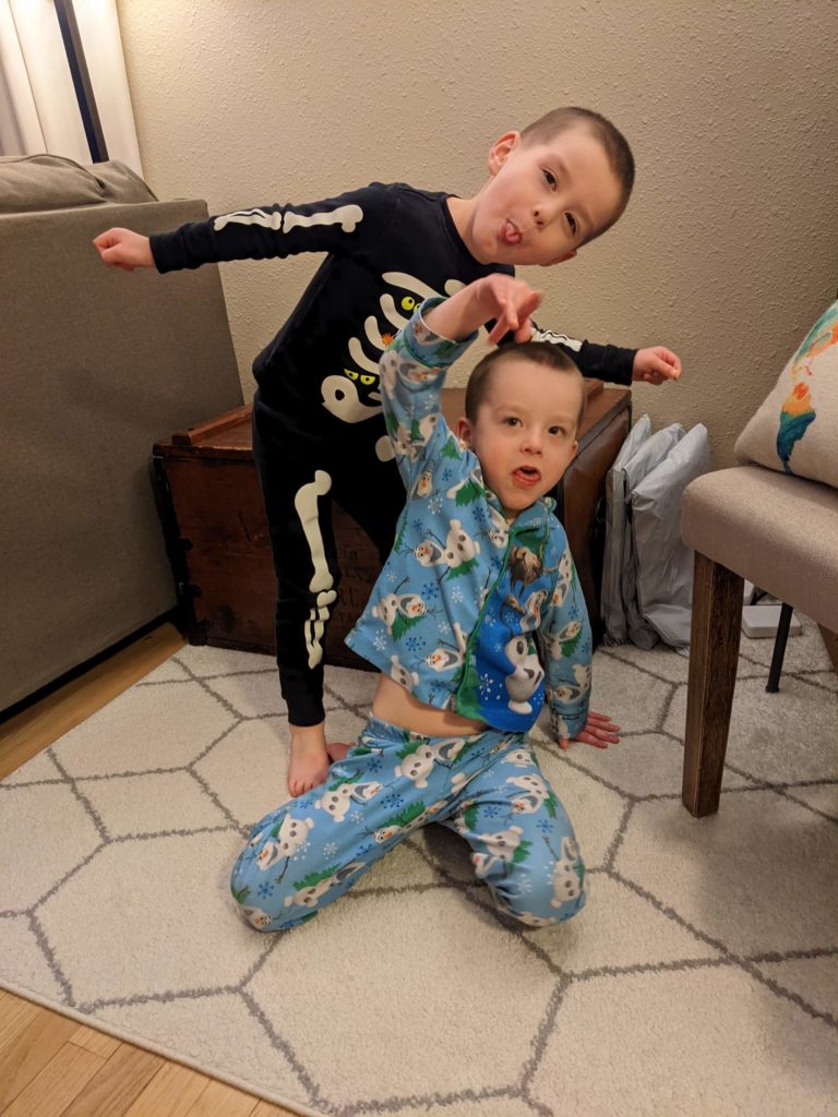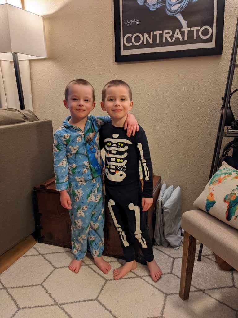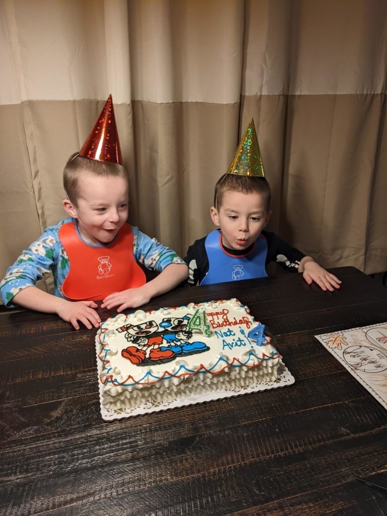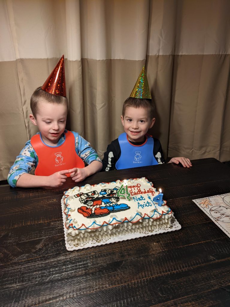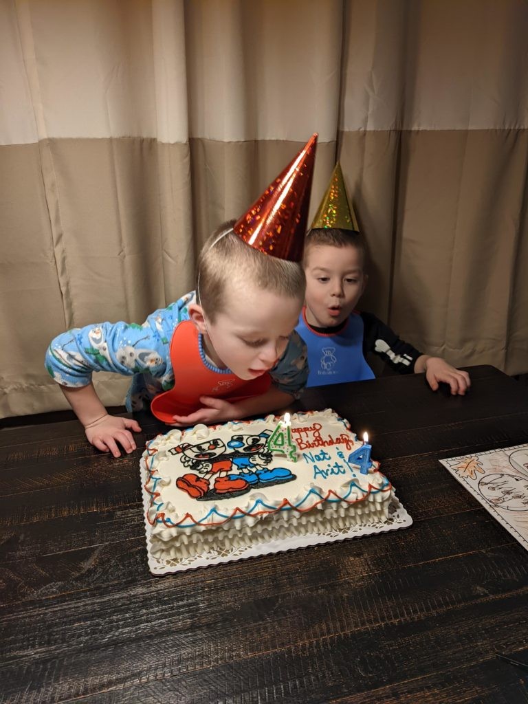 Nat loves Cuphead, Mario, his snuggies blanket and stuffed puppy Boo, being a kitty, and the color red. Avit loves Mugman, Luigi, his snuggies blanket, running around like a crazy person, and the colors yellow and blue. For their birthday dinner, Nat requested macaroni and cheese and Avit requested cocktail weinies and broccoli. They crack me up. They also live in their pj’s, just like Morrison used to before he started school. I love it.