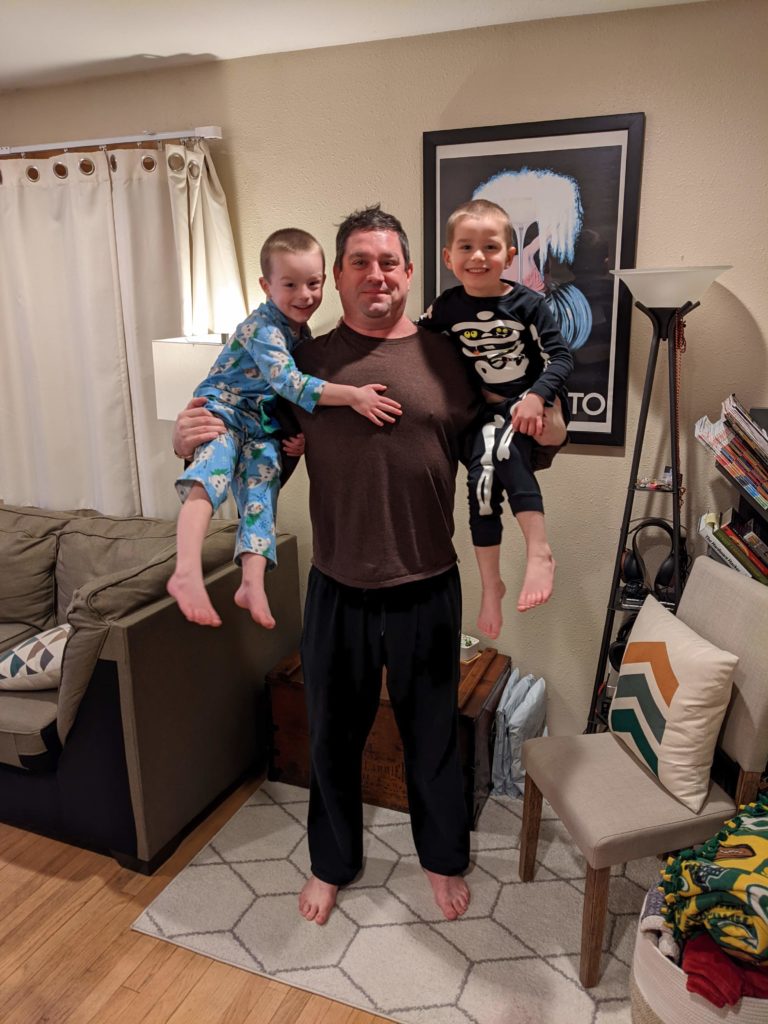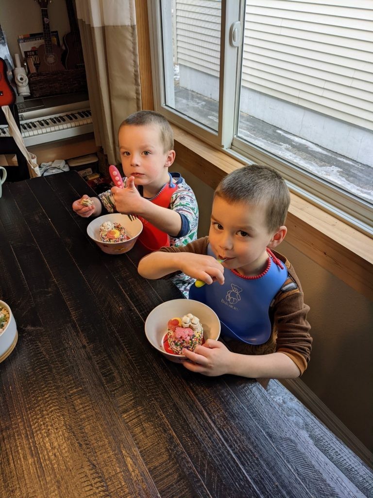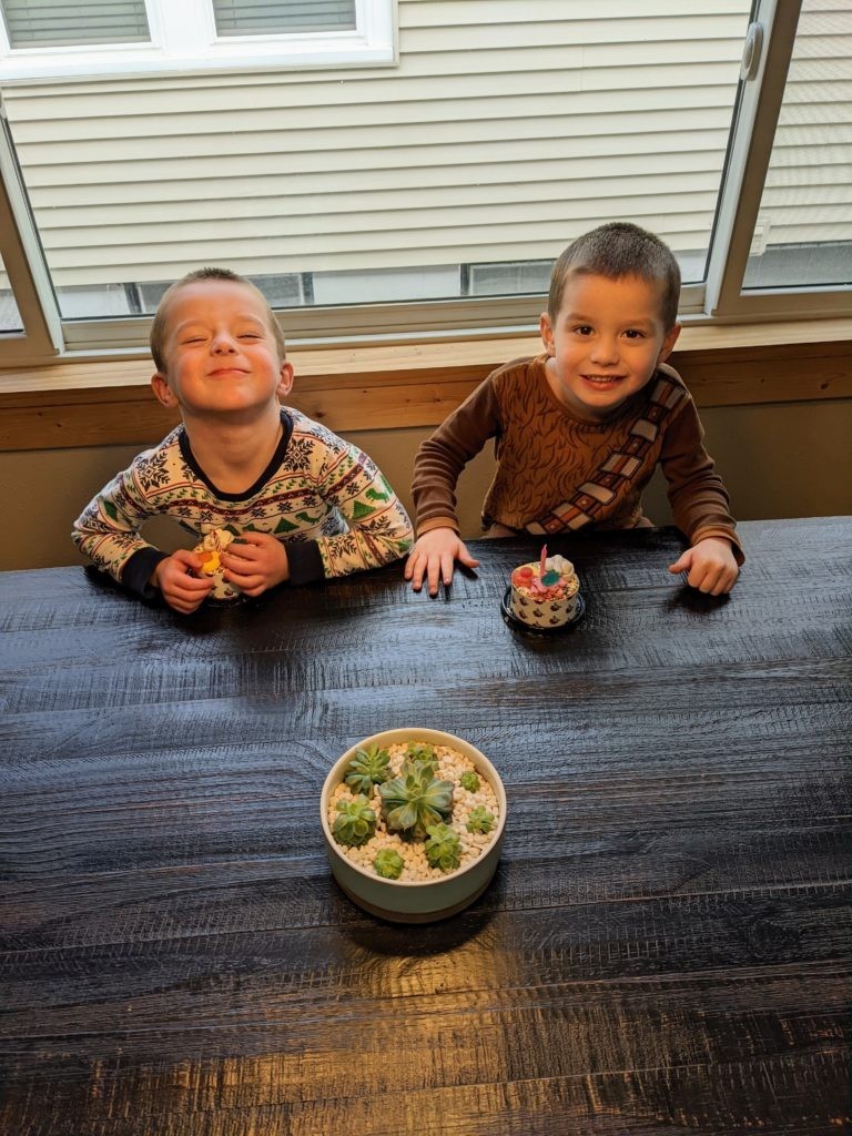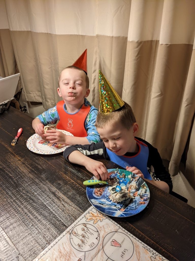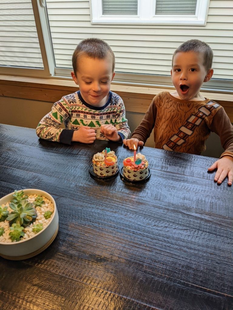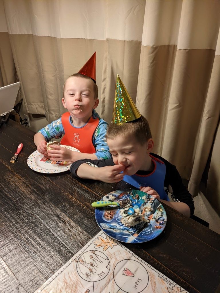 Nat loves Cuphead, Mario, his snuggies blanket and stuffed puppy Boo, being a kitty, and the color red. Avit loves Mugman, Luigi, his snuggies blanket, running around like a crazy person, and the colors yellow and blue. For their birthday dinner, Nat requested macaroni and cheese and Avit requested cocktail weinies and broccoli. They crack me up. They also live in their pj’s, just like Morrison used to before he started school. I love it.
