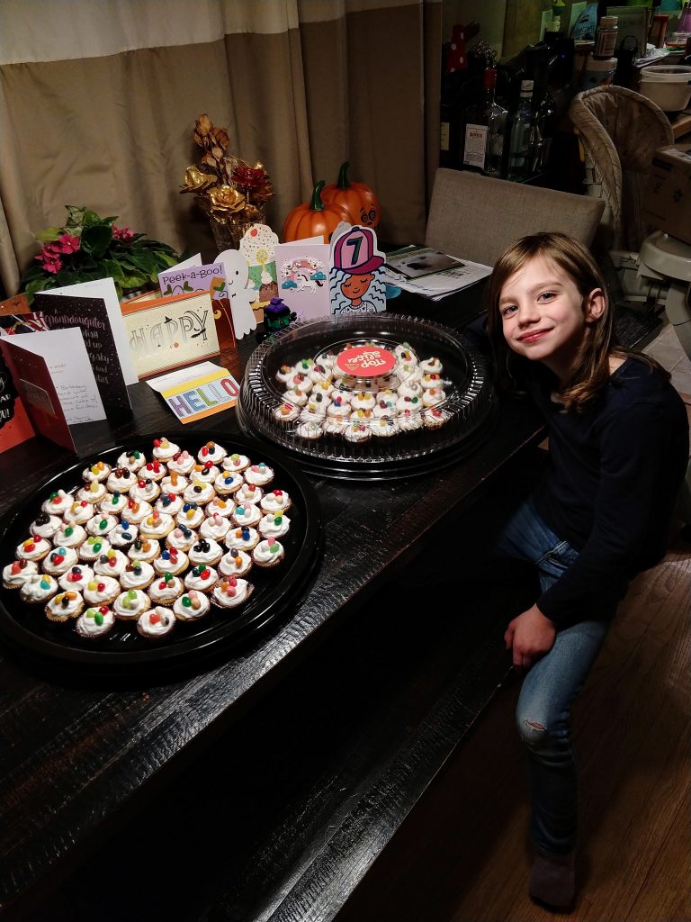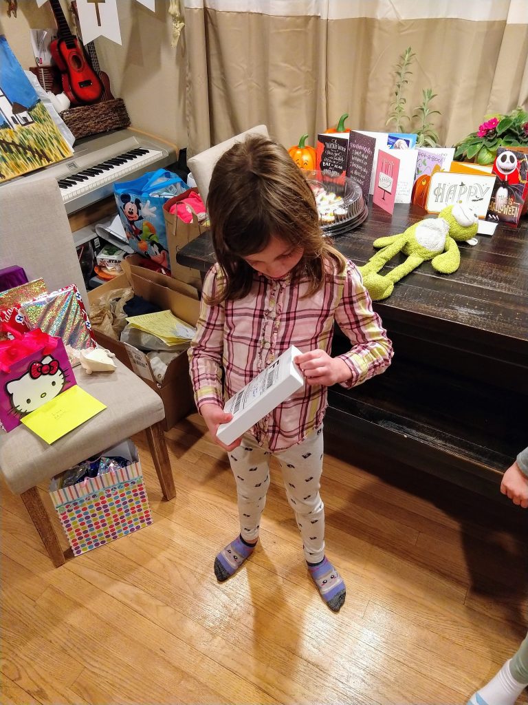 This lucky little girl got a couple birthday celebrations this year. We started off by doubling our block party as a mini birthday party for her, and she got to invite 2 friends from school. The girls helped me make mini cupcakes again, and Lana decorated them with jelly belly beans. She wanted to do candy corns on top, but for some reason we couldn’t find any at the grocery store when we were getting the ingredients. So she chose the jelly beans instead because she said they looked like little ghosts. Perfect!