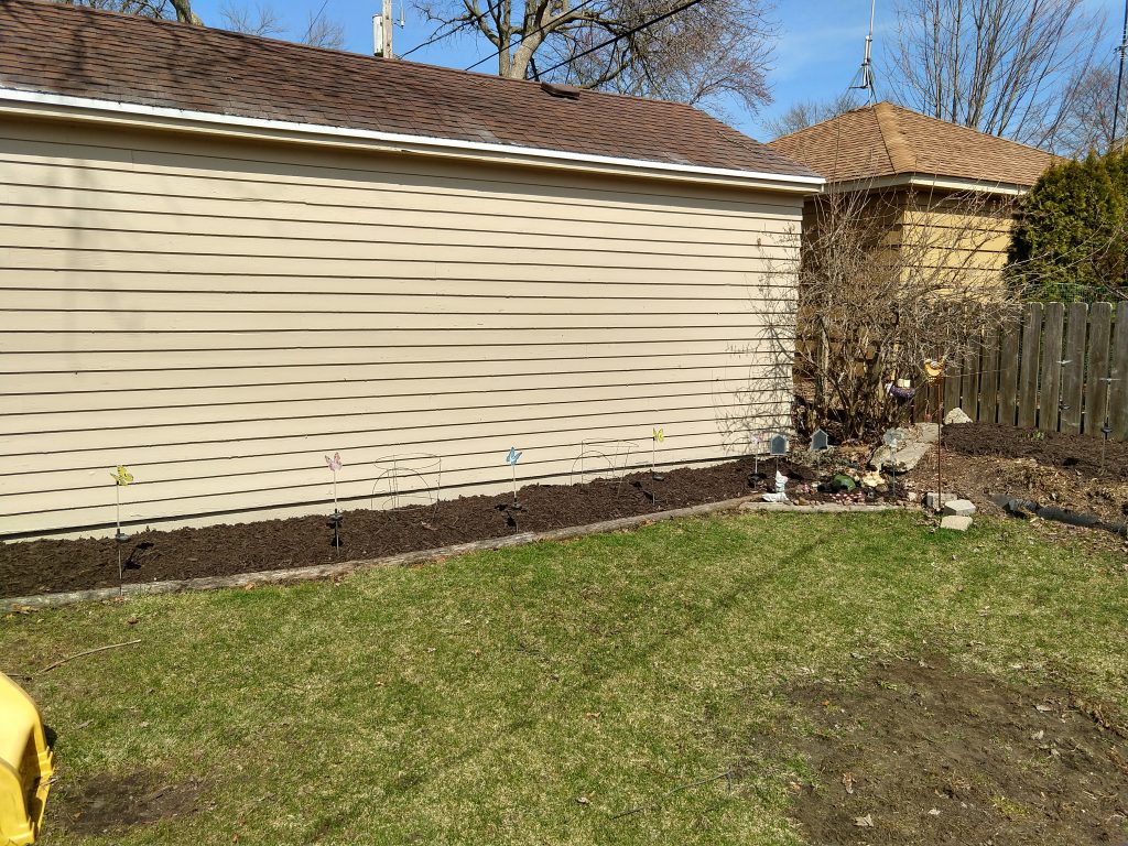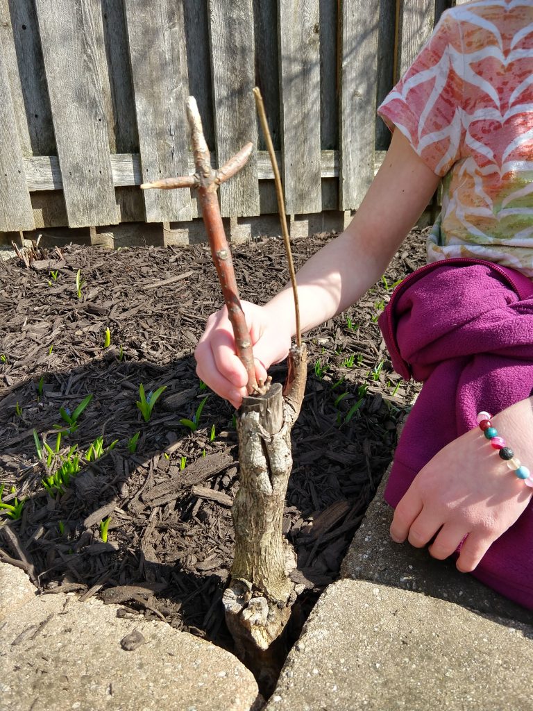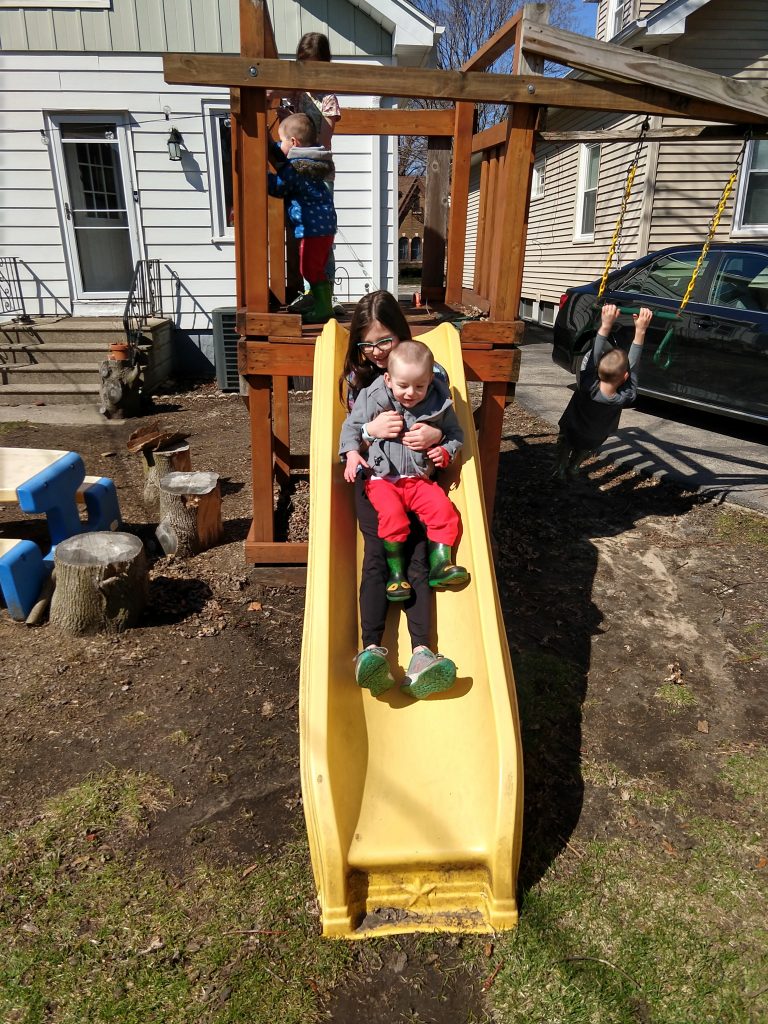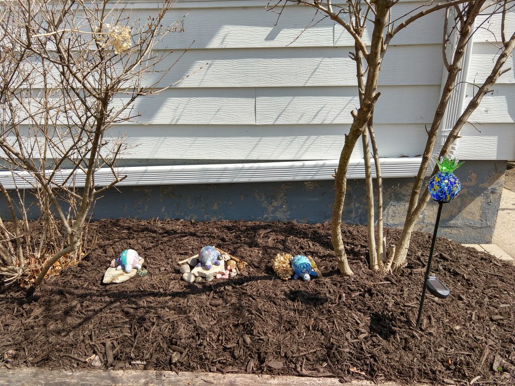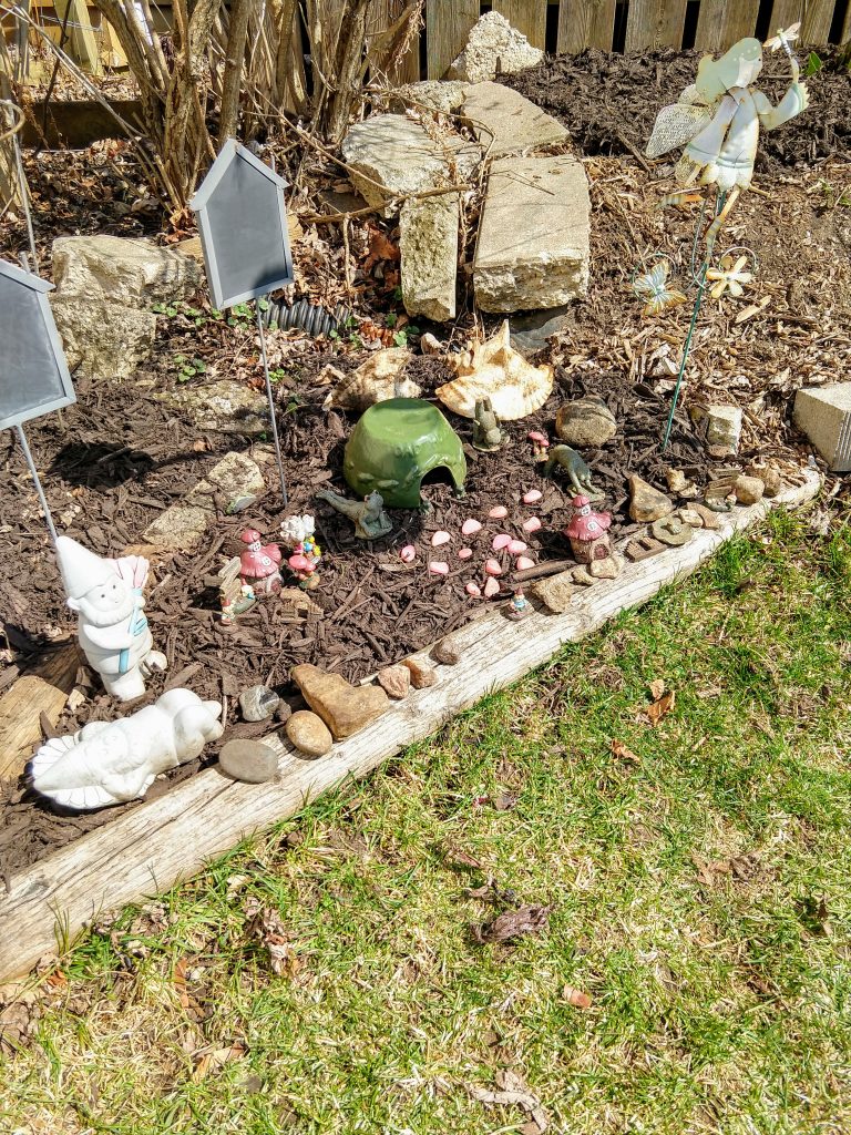 2 hours of outside play time while I spread mulch – definitely the earliest in the season I’ve ever gotten it in the gardens! The girls got their fairy garden set up after its winter buried in leaves and snow. I think we’re only missing a couple little turtles. The twins did way better than yesterday – only minimal escape attempts and a few falls in the mud. (no pictures of this today, unfortunately, since I had my wet, muddy gardening gloves on the whole time)