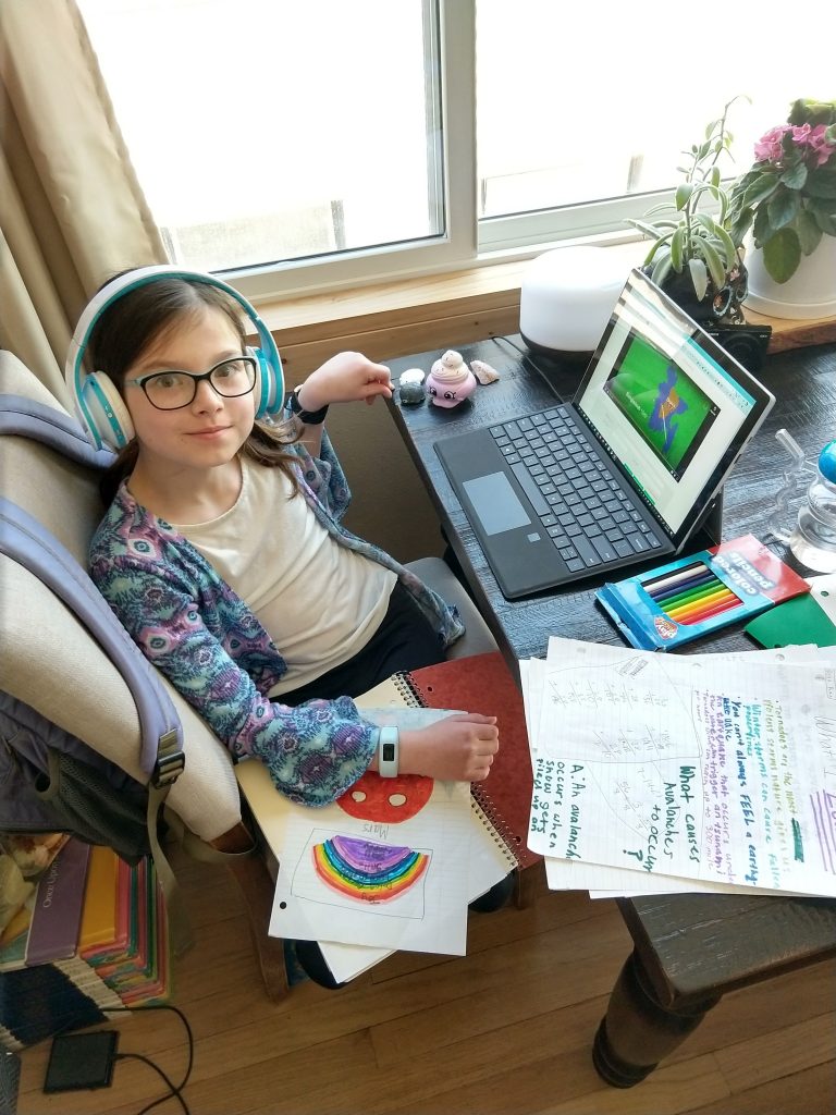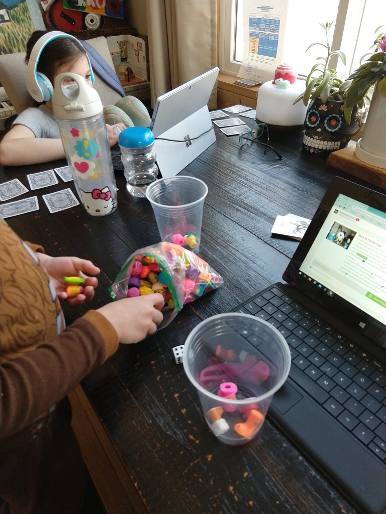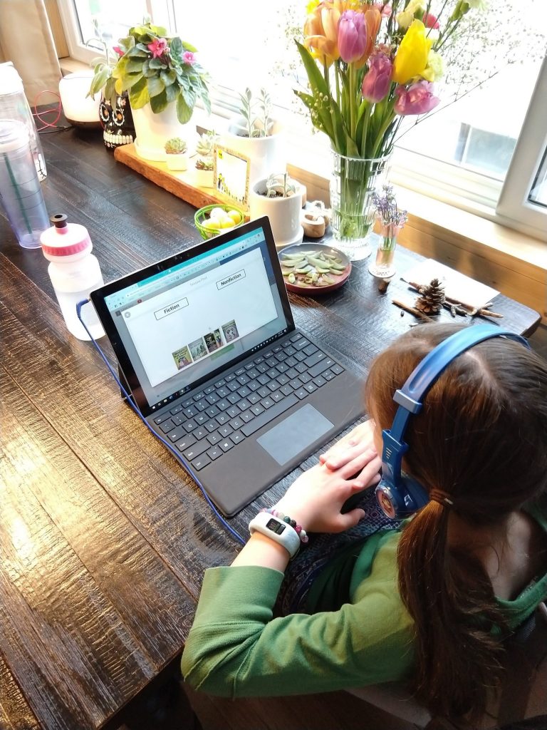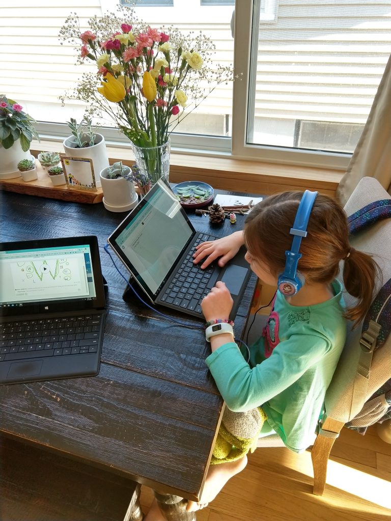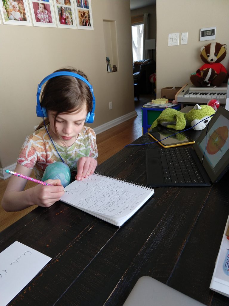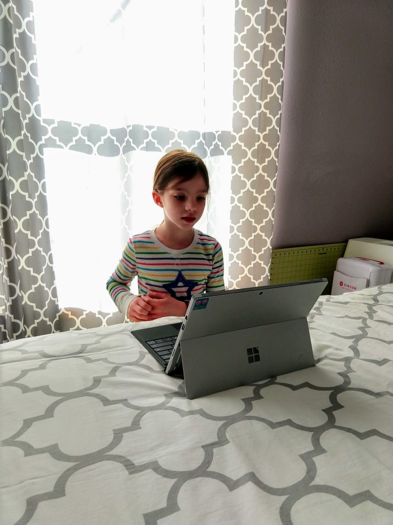 Every morning will now start with lessons for the day given to the kids by their teachers in their respective online learning platforms. They include social studies, reading, science, writing, math, P.E., art, music, guidance, and maybe Spanish. They get videos with mini-lessons from their teachers, other videos to watch, audio books to follow along with, then numerous activities to complete that correspond to each lesson. One really nice thing is that the teachers from both the girls’ grades are collaborating with all the other teachers from those grades to give the lessons. So they get to learn from all the teachers now, not just their own. They were both excited to see this.