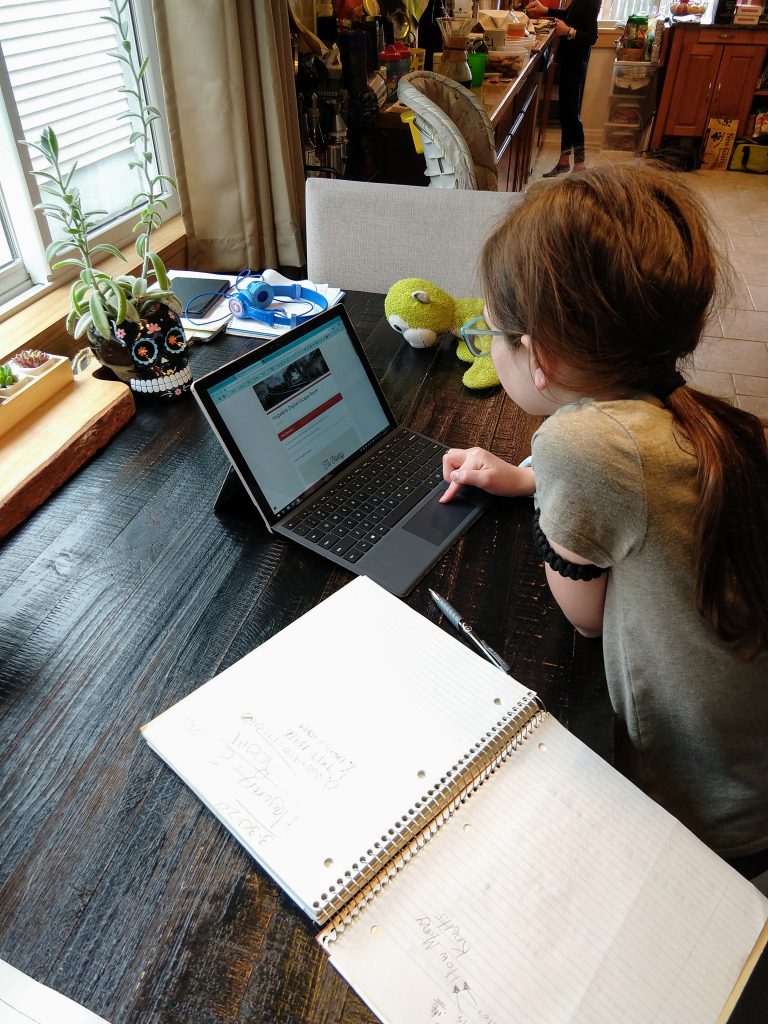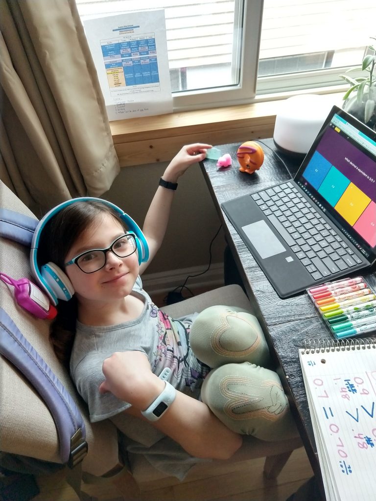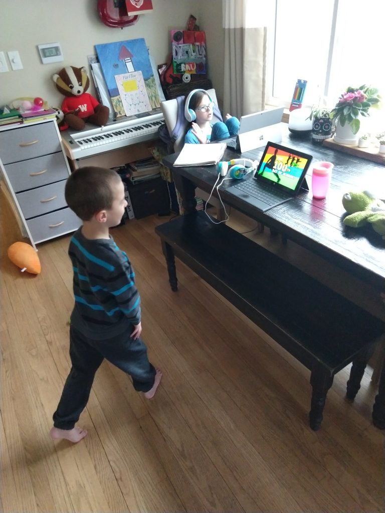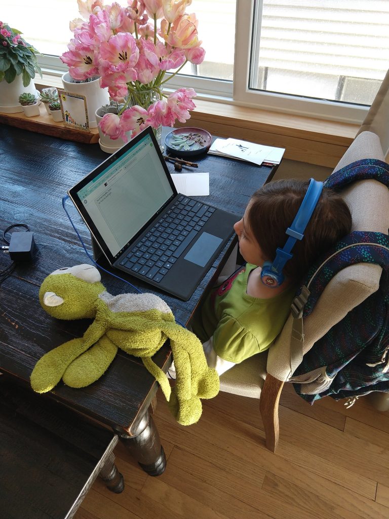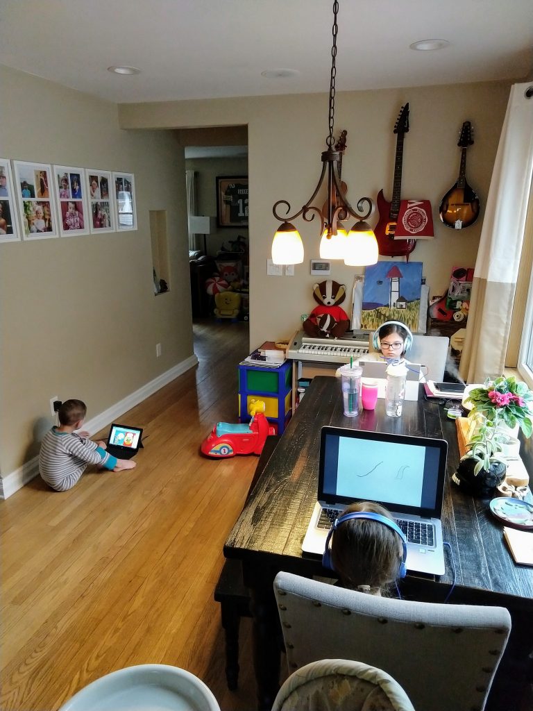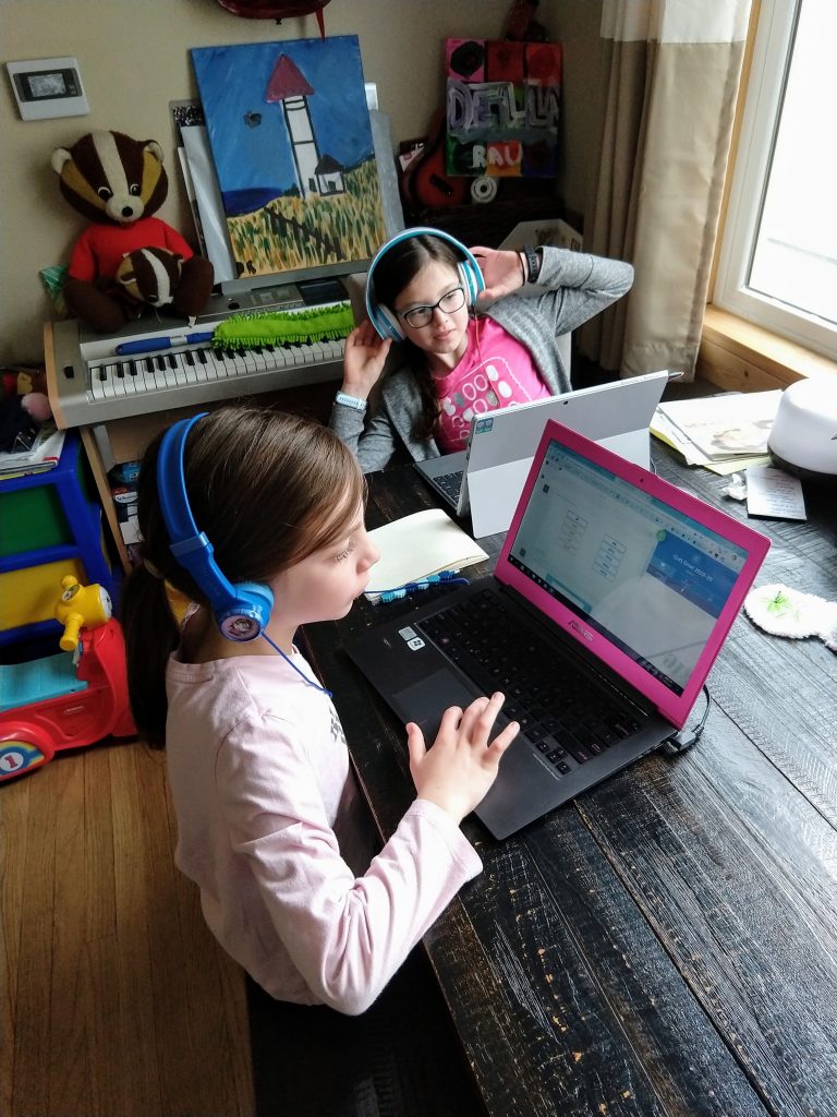 Every morning will now start with lessons for the day given to the kids by their teachers in their respective online learning platforms. They include social studies, reading, science, writing, math, P.E., art, music, guidance, and maybe Spanish. They get videos with mini-lessons from their teachers, other videos to watch, audio books to follow along with, then numerous activities to complete that correspond to each lesson. One really nice thing is that the teachers from both the girls’ grades are collaborating with all the other teachers from those grades to give the lessons. So they get to learn from all the teachers now, not just their own. They were both excited to see this.