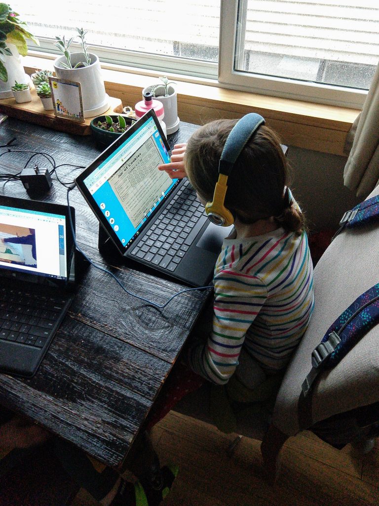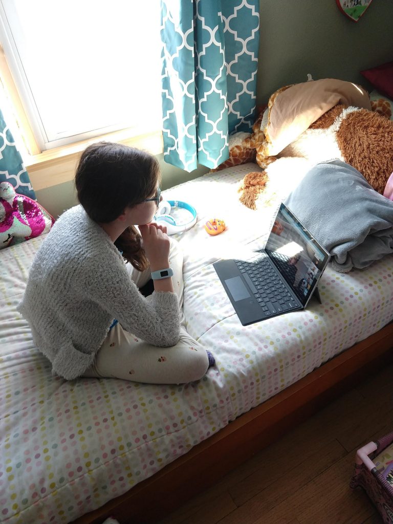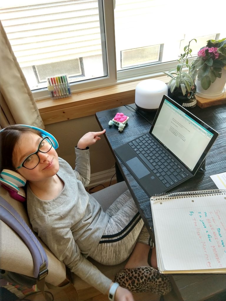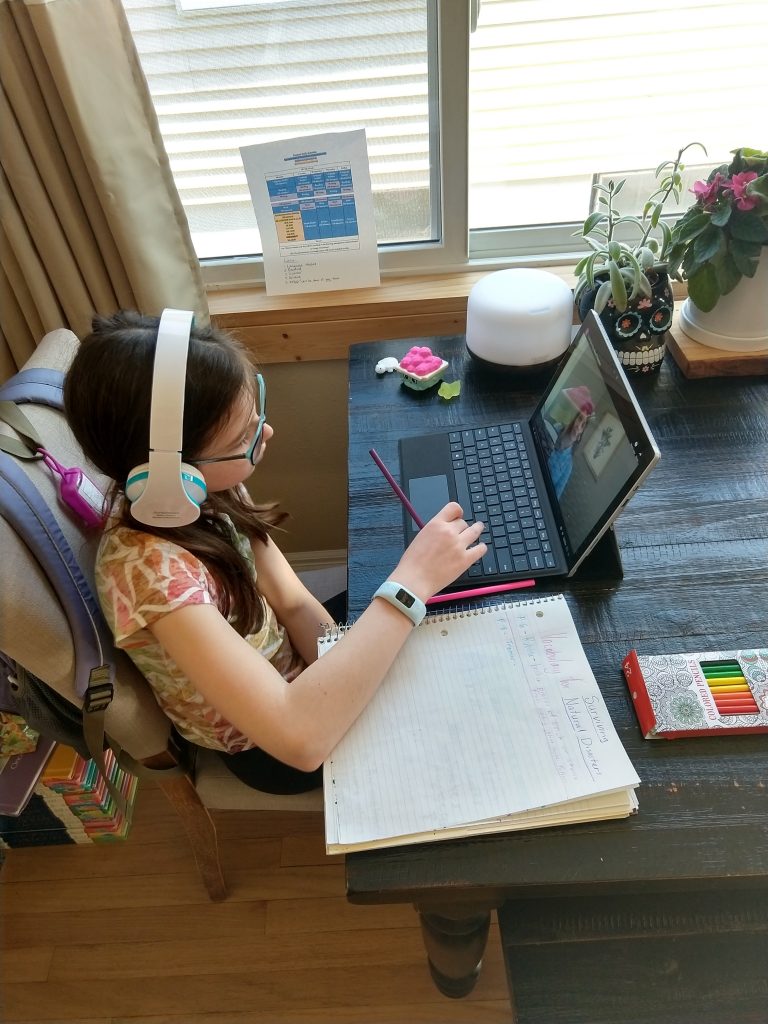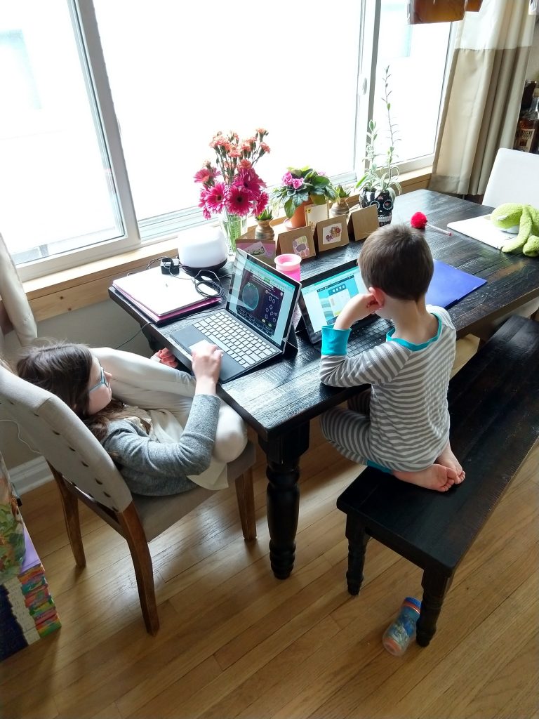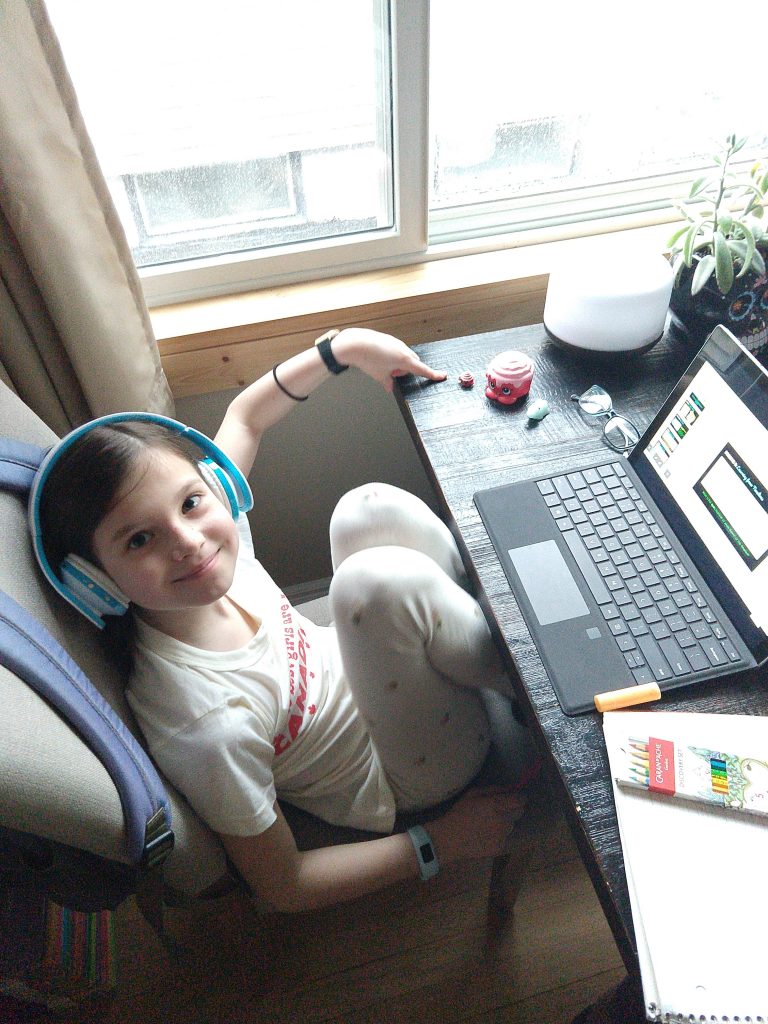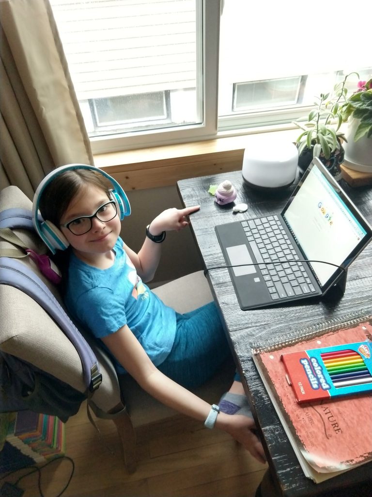Every morning will now start with lessons for the day given to the kids by their teachers in their respective online learning platforms. They include social studies, reading, science, writing, math, P.E., art, music, guidance, and maybe Spanish. They get videos with mini-lessons from their teachers, other videos to watch, audio books to follow along with, then numerous activities to complete that correspond to each lesson. One really nice thing is that the teachers from both the girls’ grades are collaborating with all the other teachers from those grades to give the lessons. So they get to learn from all the teachers now, not just their own. They were both excited to see this.