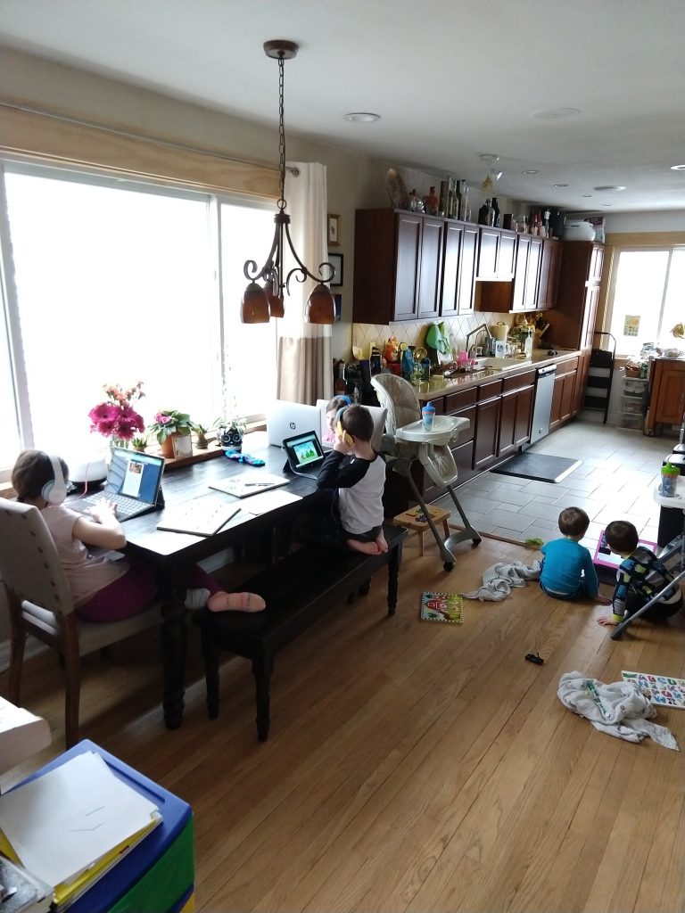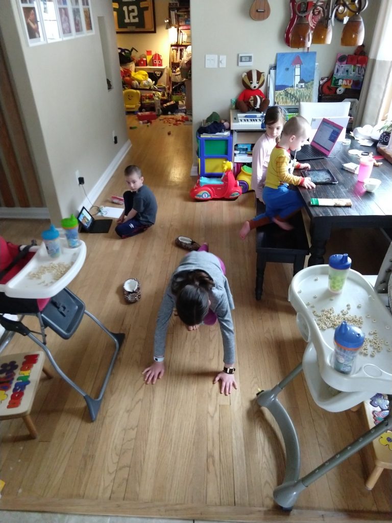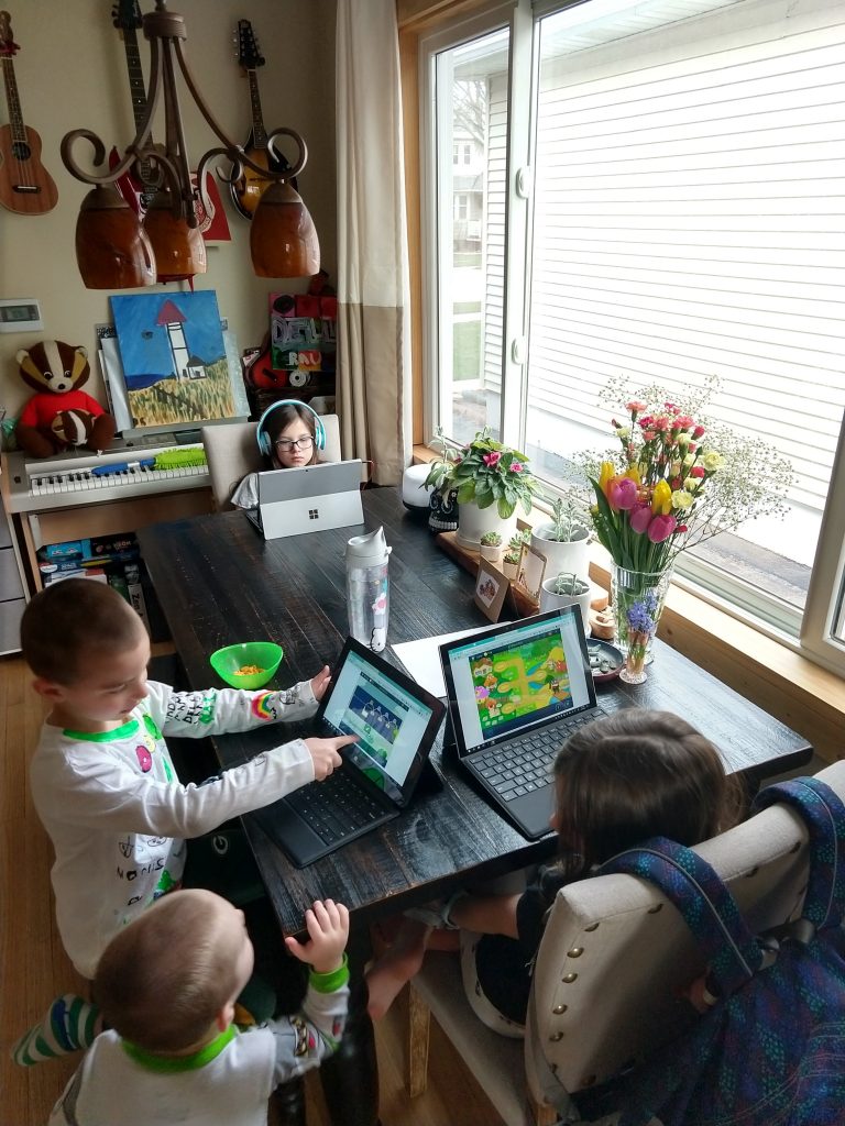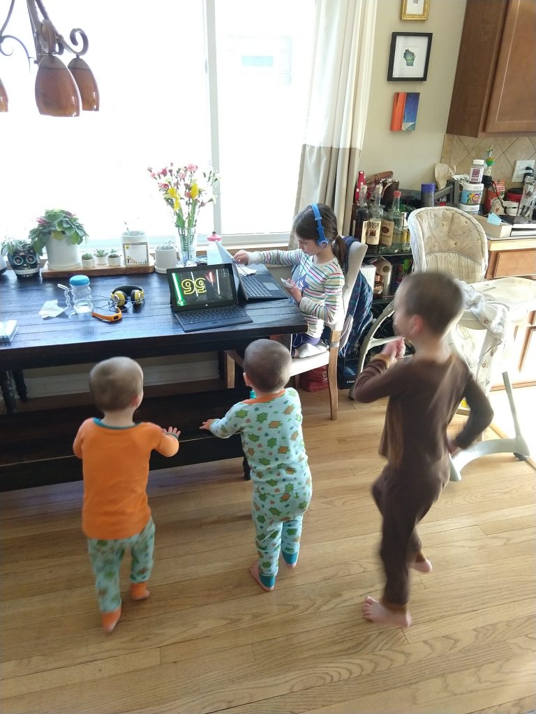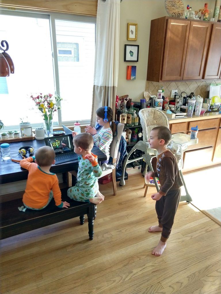 I asked the big 3 last night how they felt about not being able to go back to school and having to be home all the time. They said it wasn’t that bad and they like doing school online, but Della said she does miss seeing everyone. I asked if there was anything they felt was bad about all of this, and they said no, it’s fine for them. Morrison of course said he has a bad thing, he gets bored, but see above. I’m making a very conscious effort to ensure they know it’s completely ok and normal to feel very weird and mixed up and even sad about this whole situation. It’s something none of us have ever had to deal with, and I can only imagine what it’s like being a kid right now: All of a sudden your teachers tell you you won’t be coming back to school for a little while, which probably feels like an exciting surprise vacation break, then after a certain point you get bored because you can’t go see your friends or play with anyone outside but your siblings (at least these kids have plenty of those!), it’s hard to understand that you can’t just go see and hug family like you always do, we can’t just go places anymore, you kind of get used to me giving you mini-lessons at home on topics that are new and different from what you usually do at school, then suddenly you have to sit at a computer all morning and do real school lessons but at home. Shit. I’d get antsy and all mixed up, too. So I feel very strongly that I need to keep an eye on their emotions more than anything right now. They really are doing an excellent job adapting through all this with basically no push-back at all, so I make sure to tell them how proud we are of them and how great they’re doing.