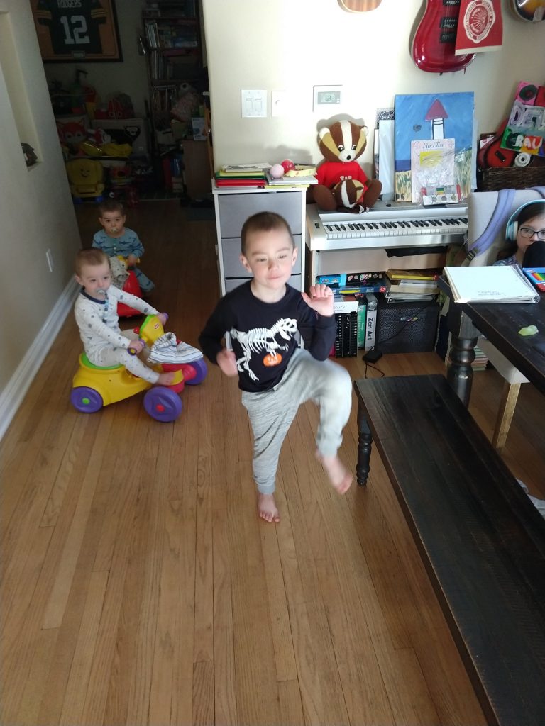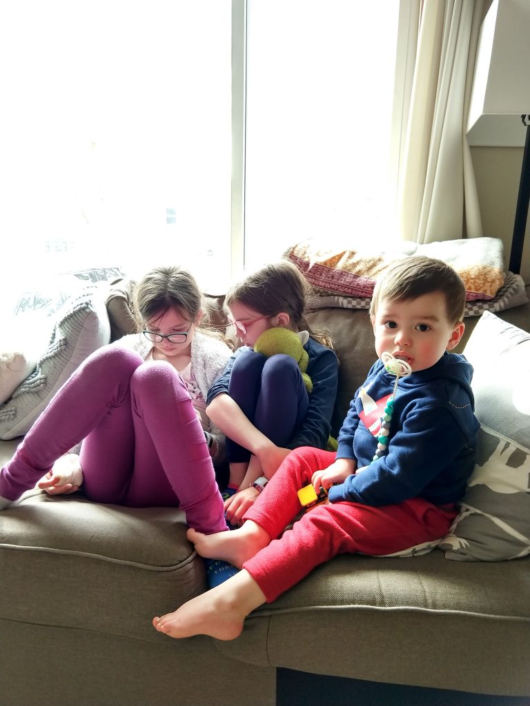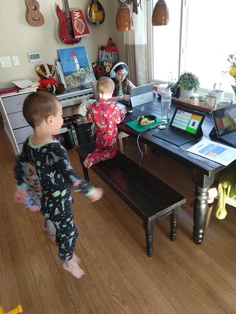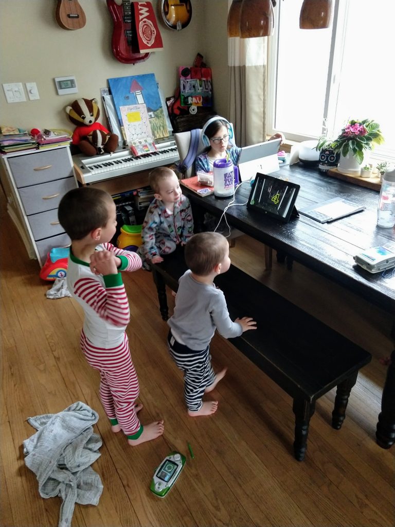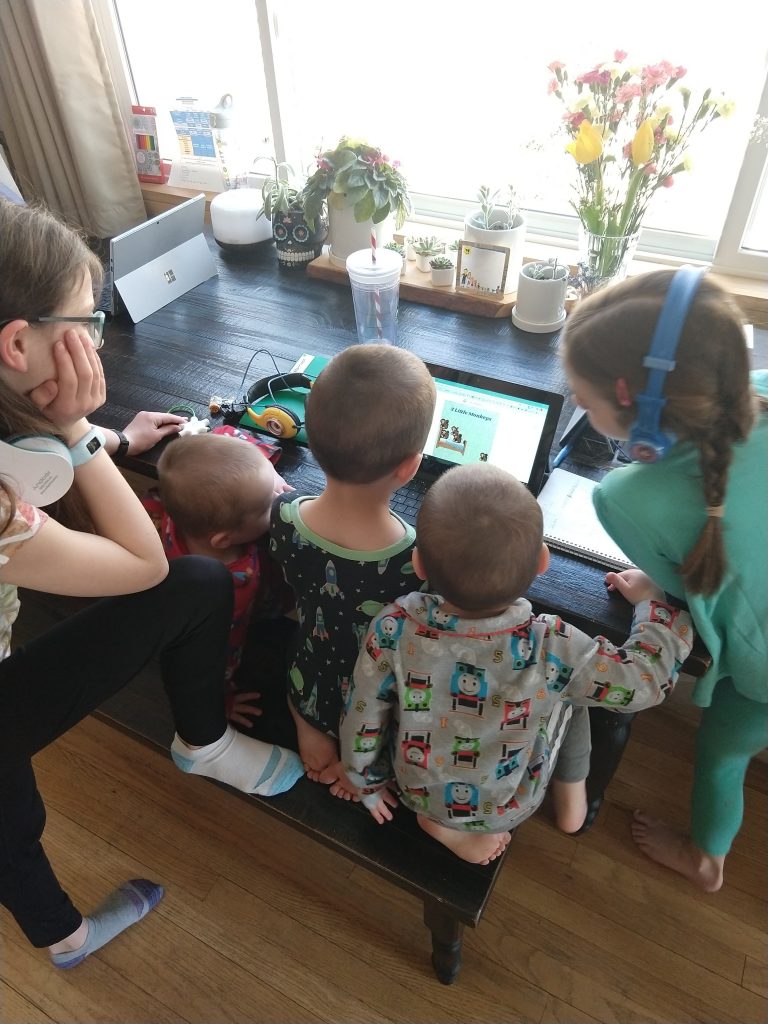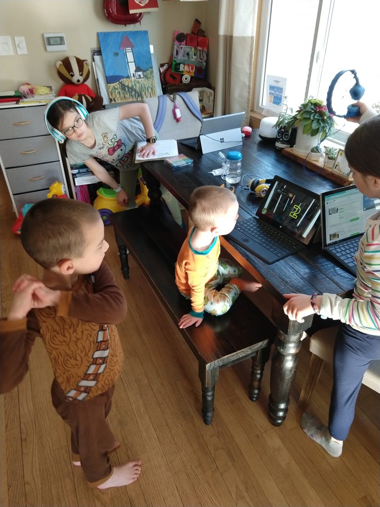 I asked the big 3 last night how they felt about not being able to go back to school and having to be home all the time. They said it wasn’t that bad and they like doing school online, but Della said she does miss seeing everyone. I asked if there was anything they felt was bad about all of this, and they said no, it’s fine for them. Morrison of course said he has a bad thing, he gets bored, but see above. I’m making a very conscious effort to ensure they know it’s completely ok and normal to feel very weird and mixed up and even sad about this whole situation. It’s something none of us have ever had to deal with, and I can only imagine what it’s like being a kid right now: All of a sudden your teachers tell you you won’t be coming back to school for a little while, which probably feels like an exciting surprise vacation break, then after a certain point you get bored because you can’t go see your friends or play with anyone outside but your siblings (at least these kids have plenty of those!), it’s hard to understand that you can’t just go see and hug family like you always do, we can’t just go places anymore, you kind of get used to me giving you mini-lessons at home on topics that are new and different from what you usually do at school, then suddenly you have to sit at a computer all morning and do real school lessons but at home. Shit. I’d get antsy and all mixed up, too. So I feel very strongly that I need to keep an eye on their emotions more than anything right now. They really are doing an excellent job adapting through all this with basically no push-back at all, so I make sure to tell them how proud we are of them and how great they’re doing.