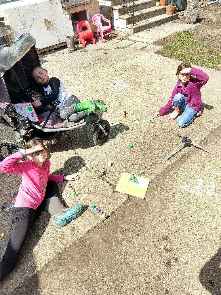 Playing outside and painting happiness rocks that we’ll spread on a walk later this week sometime