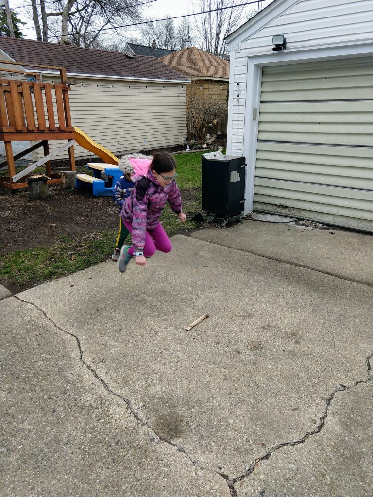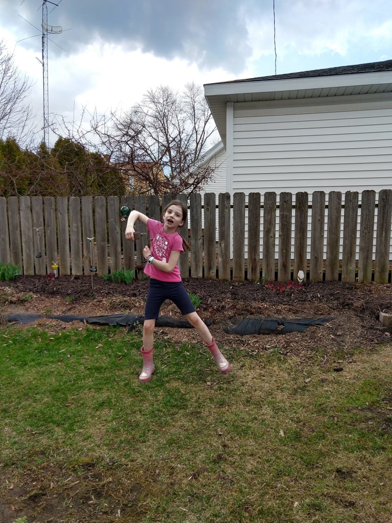 P.E. outside – playing throw the ball over the garage, catch, and running around