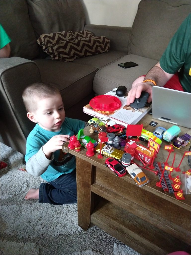 Ryan got the boys a tub of little firefighters, trucks, signs, etc., because Avit absolutely loves a set of tiny construction signs they got for Christmas. I gave it to them this afternoon, and a massive game of signs/firefighters/cars/dinosaurs ensued.