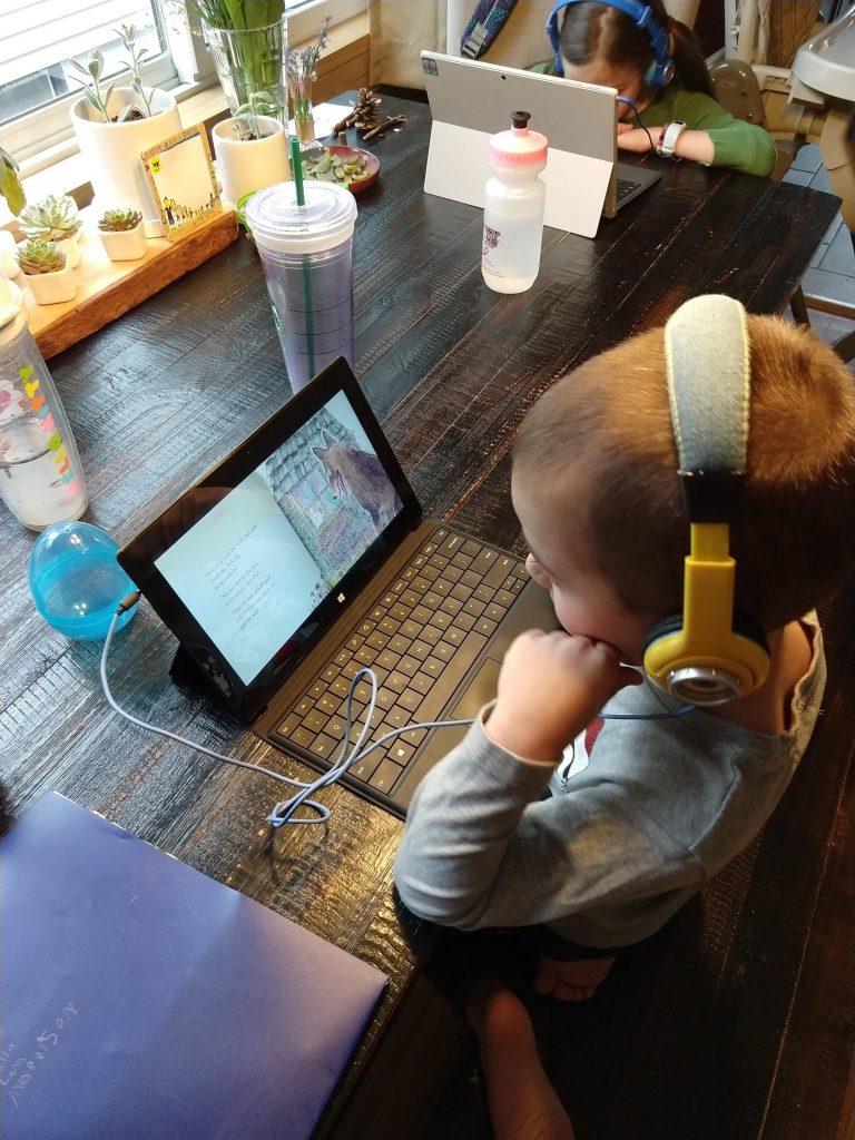 A little Seesaw class exercise for M, Google Classroom assignments for D, and Epic reading for L while I took the twins on a run