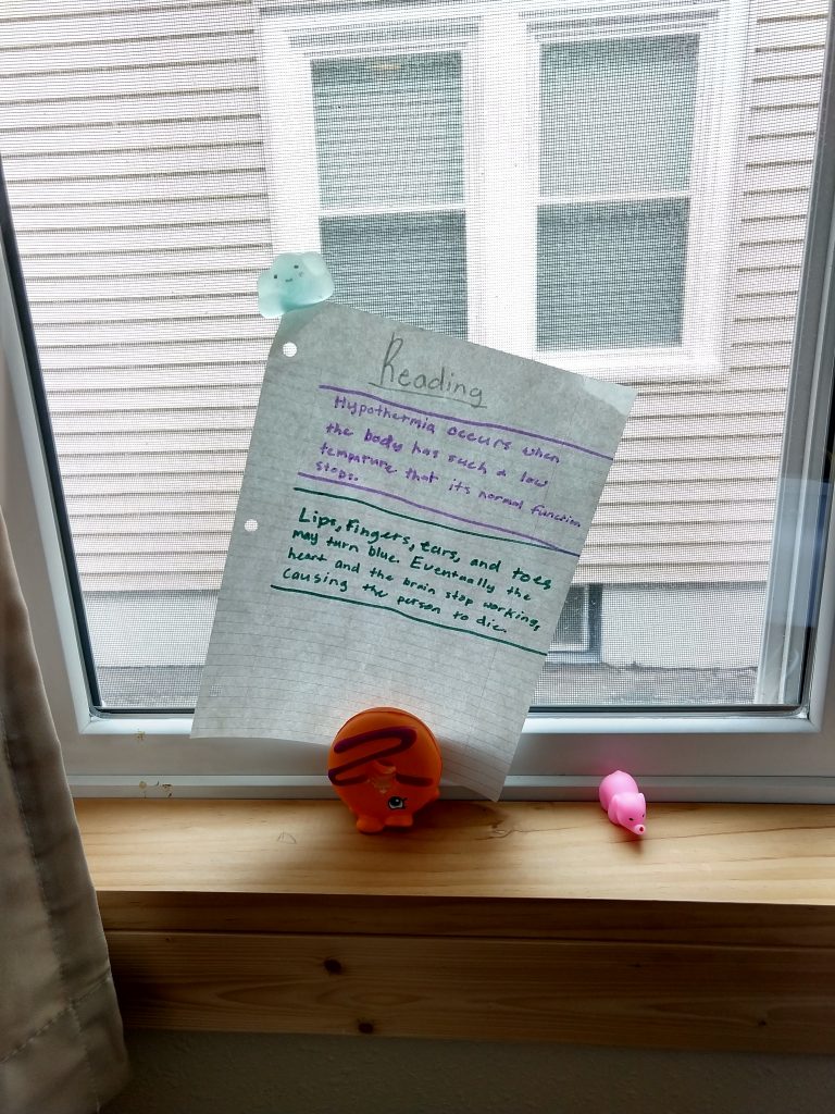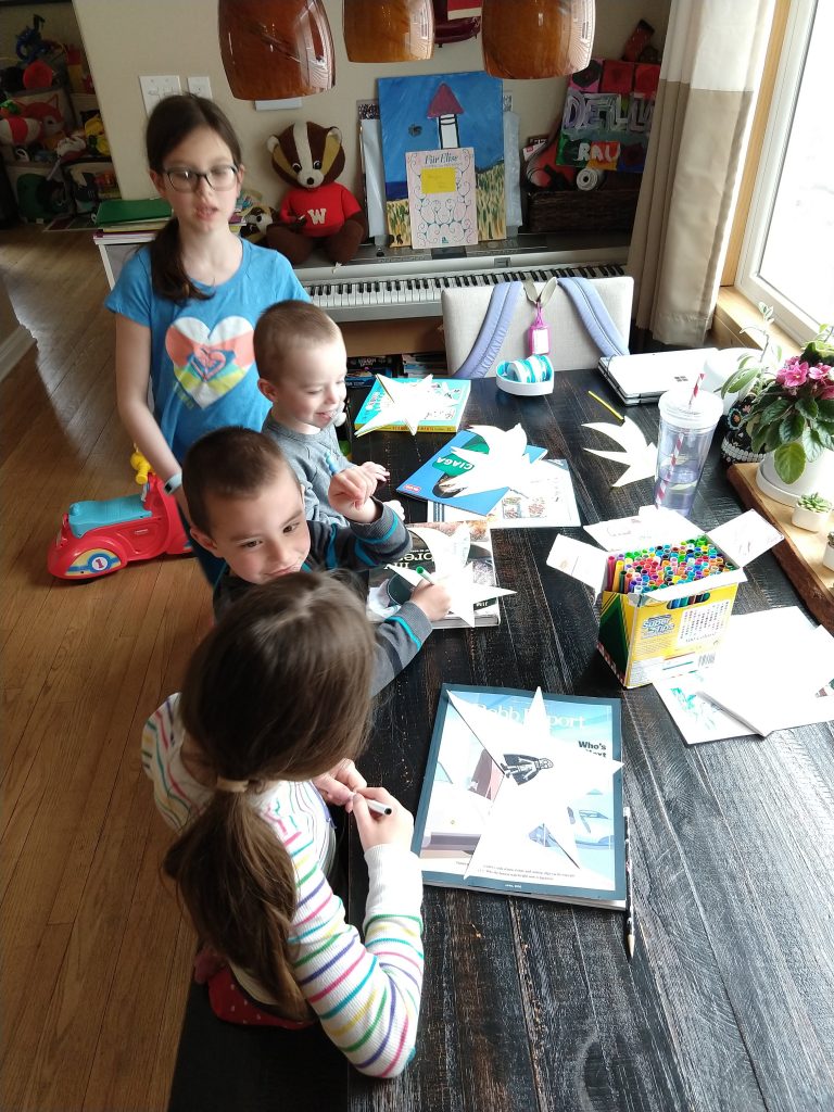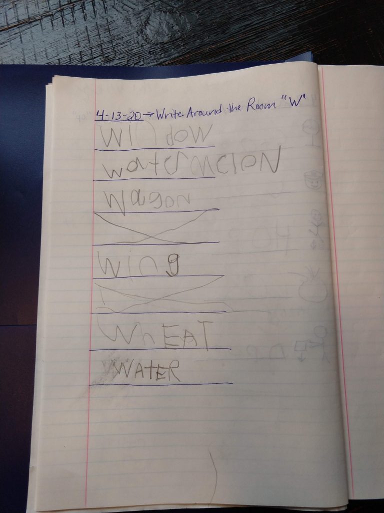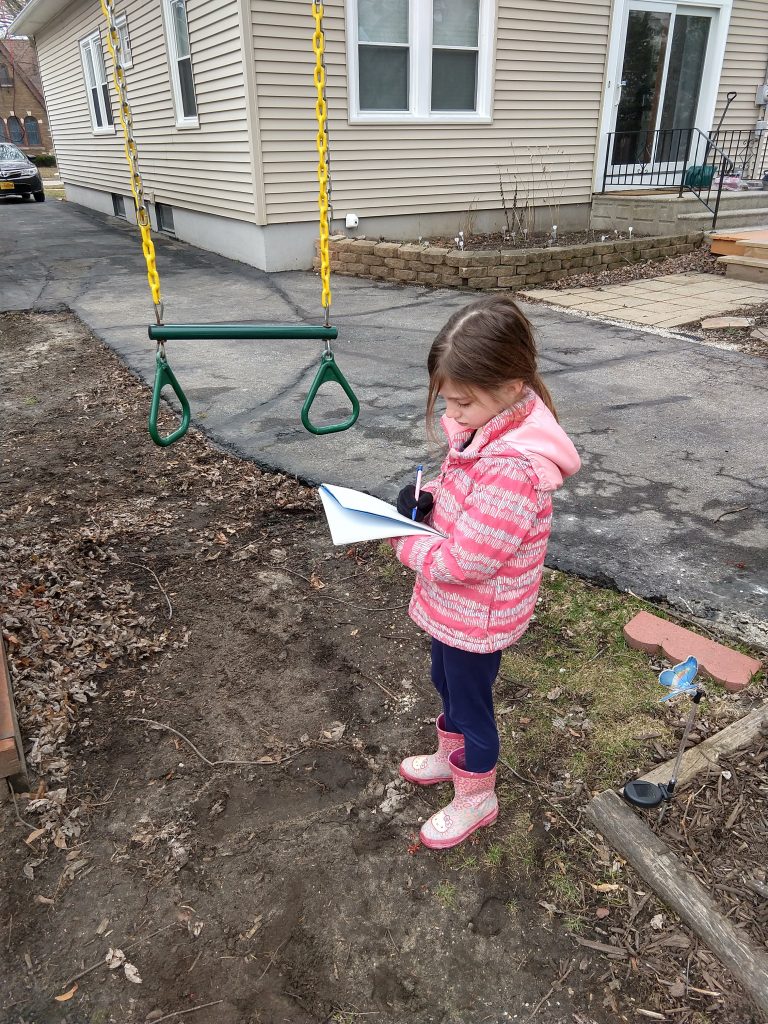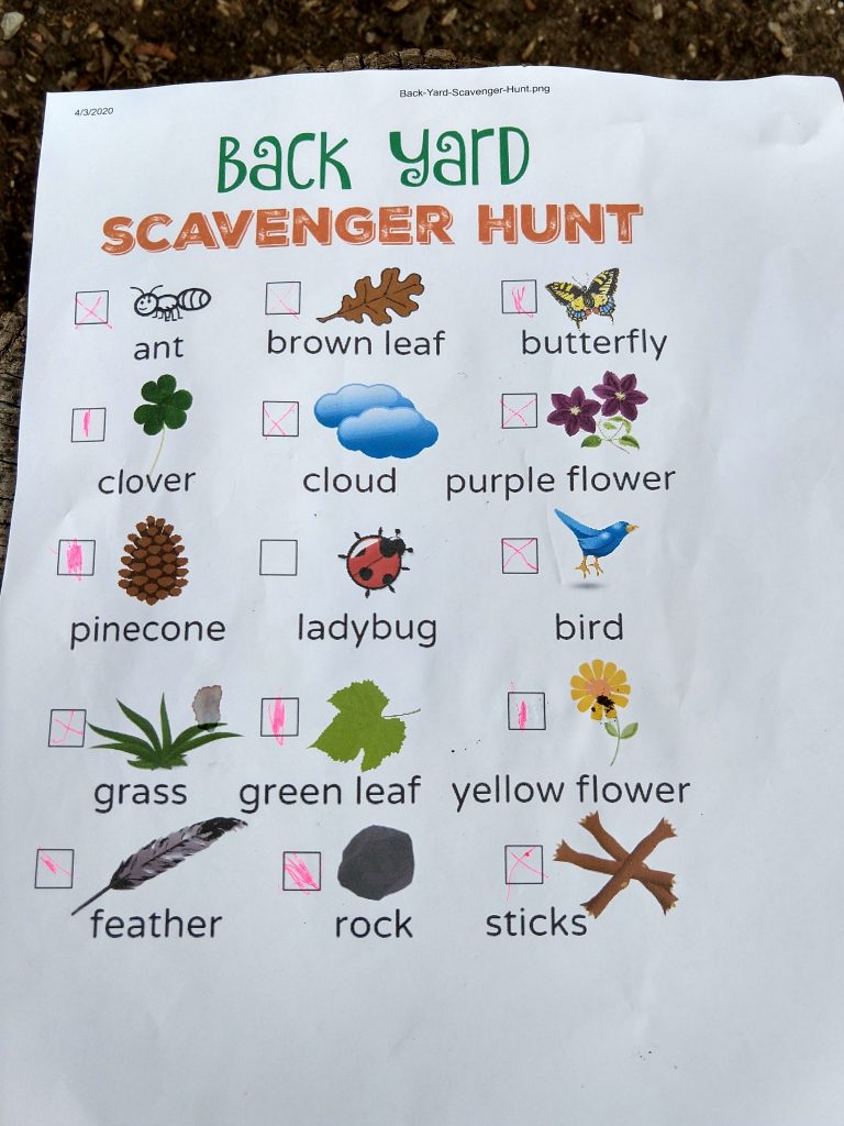 Back yard scavenger hunt for M, indoor and outdoor math scavenger hunt for L, decade of my life paragraph assignment for D (this is a report they started right before school got shut down – a paragraph and picture for each year of their life so far)