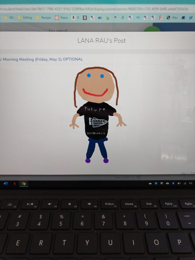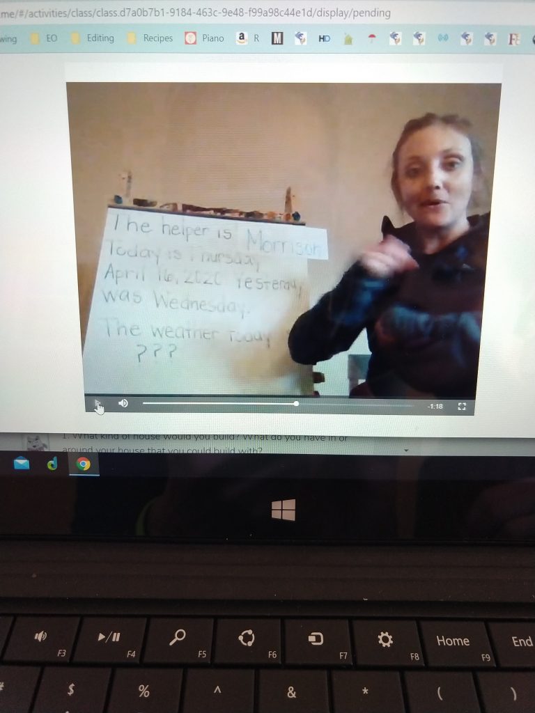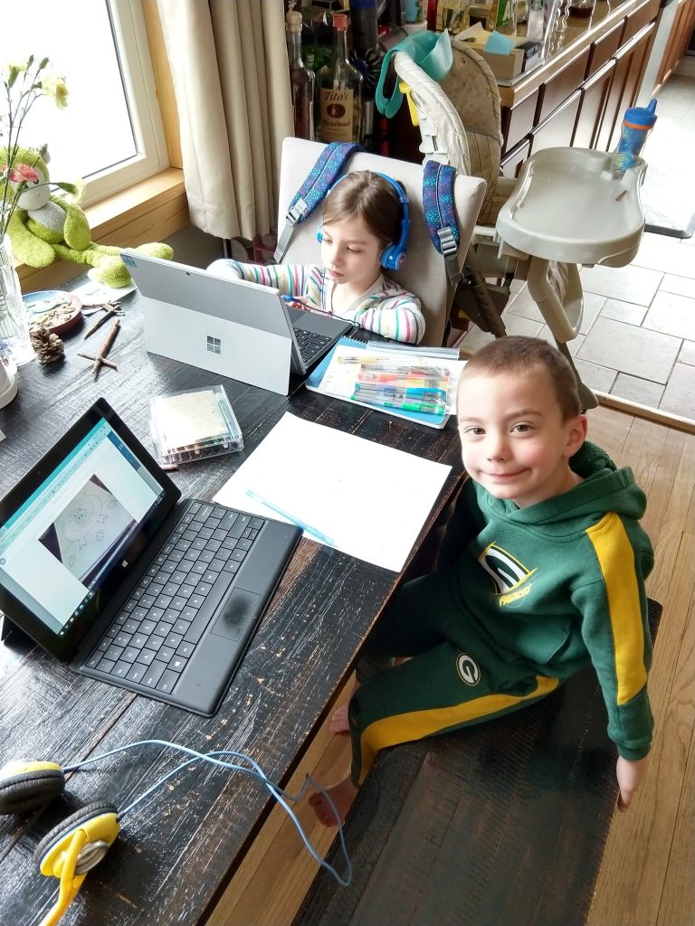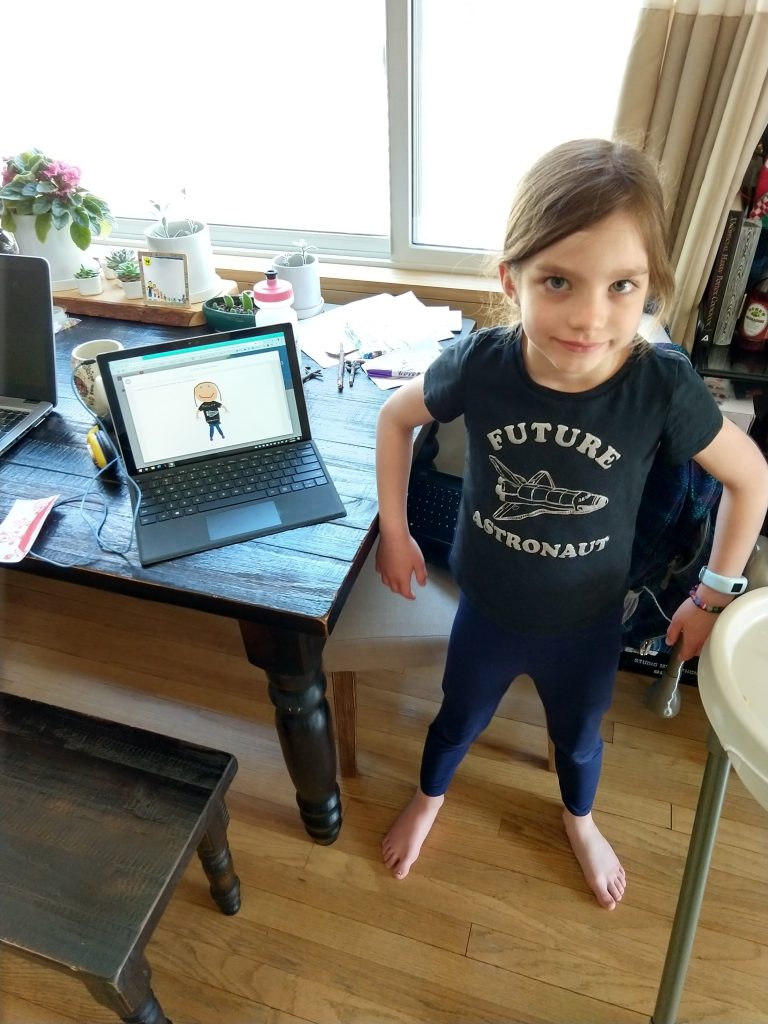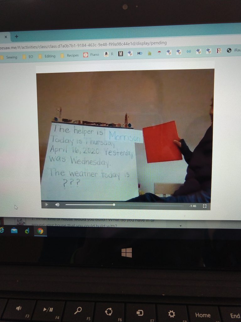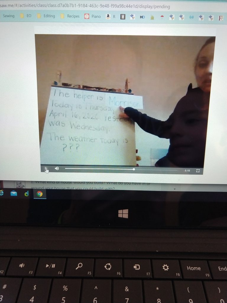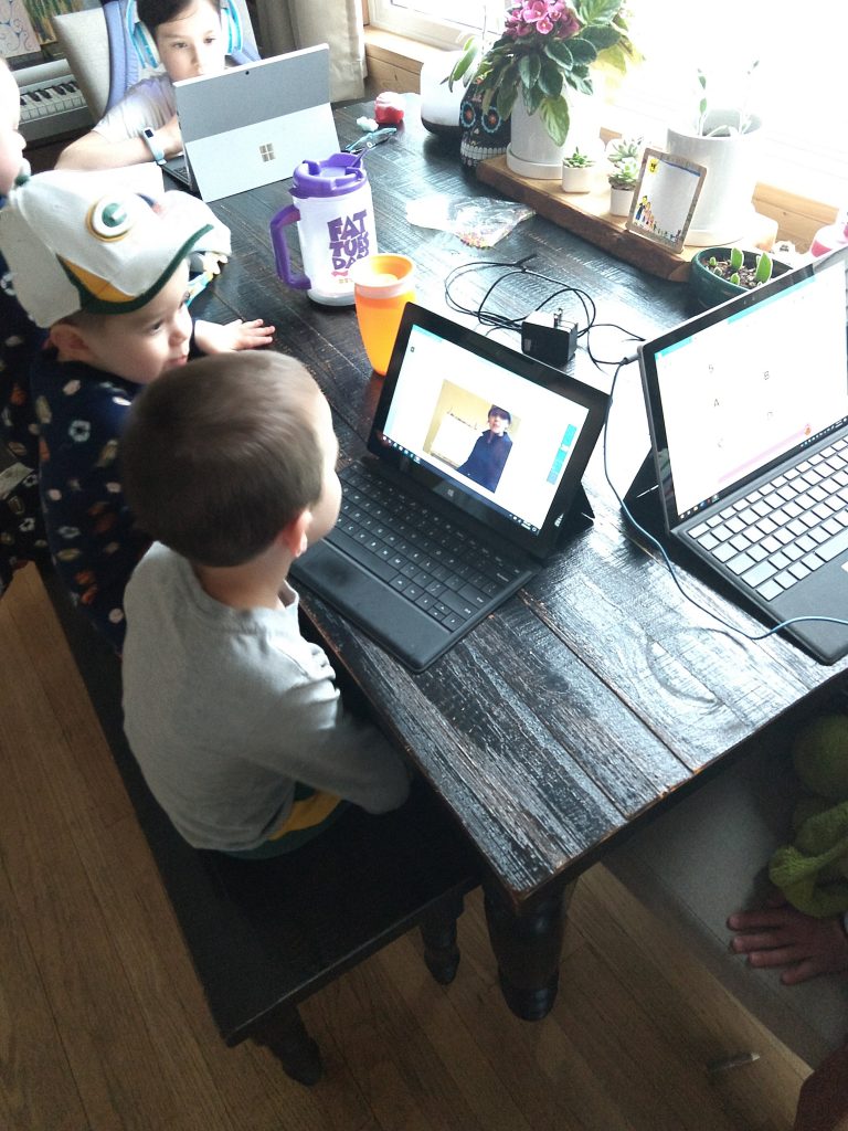 They all have half-hour, in-person video meetings with their classes on Mondays, which are awesome. This week they all got to talk about fun things they’ve been doing so far at home while we’ve been away from school.