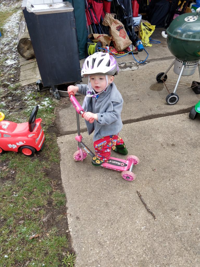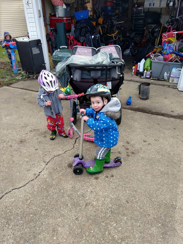 It was freezing outside today after our mini-snow last night, but the boys especially wanted to go out and play. So after Morrison’s ending P.E. lesson, I sent the 3 of them out into the backyards. Yes, alone, but they did a great job all staying back there until I could come out. M got helmets on the twins and everything so they could scooter around. He loves them so much!