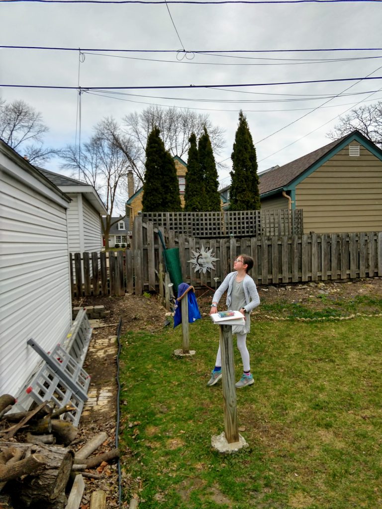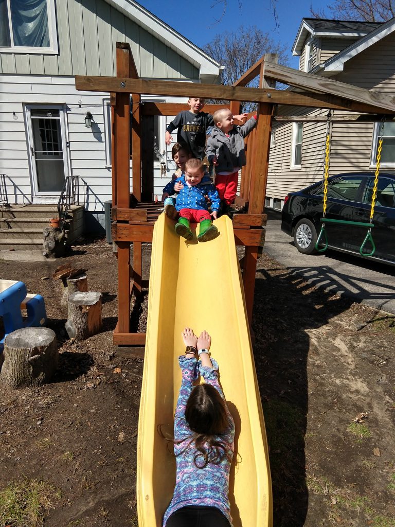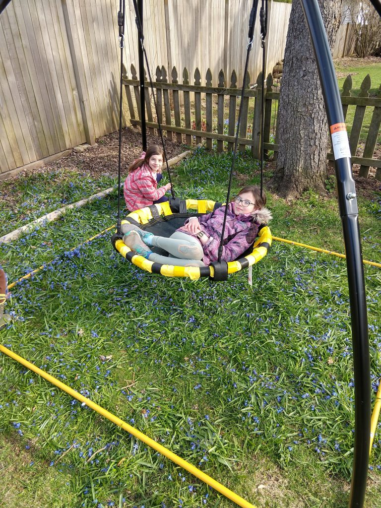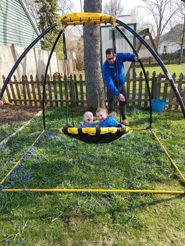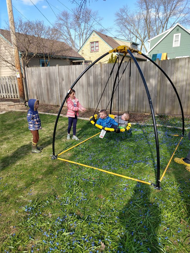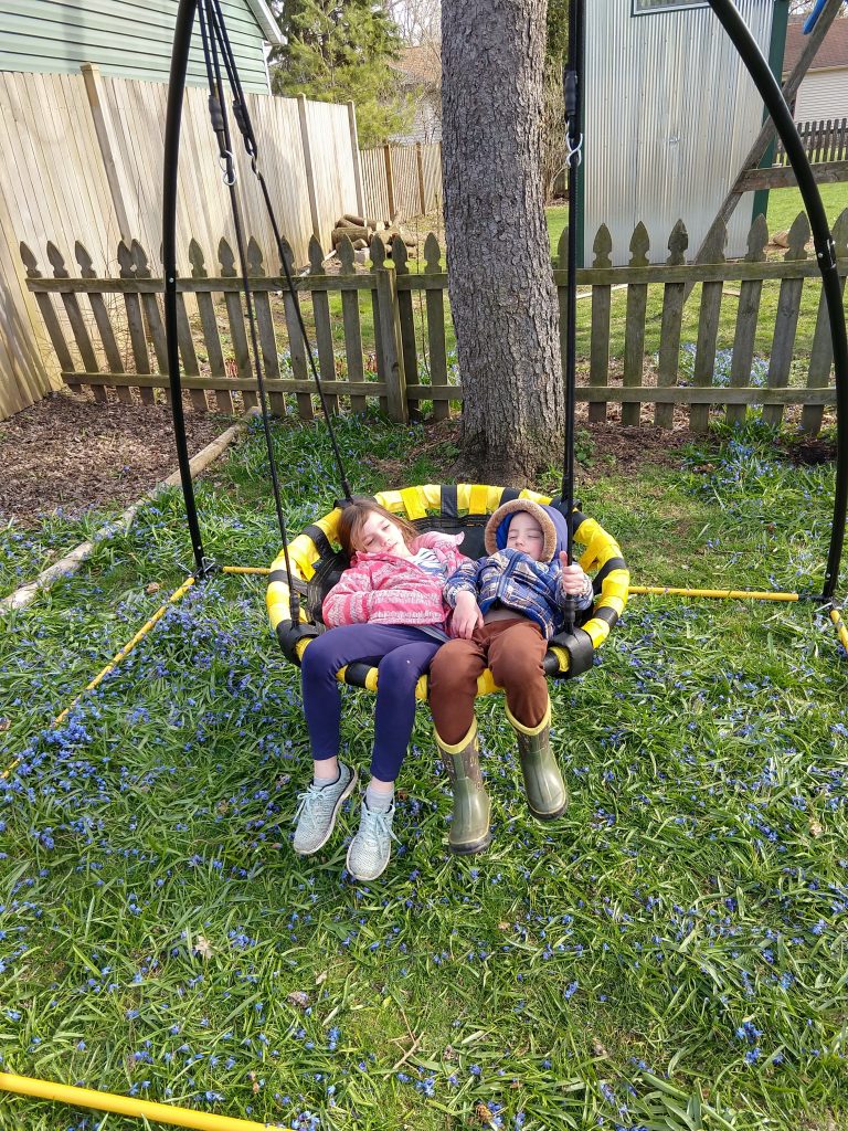 The sun was out, yet still chilly, but Ryan assembled the new swing for the kids anyway. It’s in the back corner of our back back yard, under a big pine tree, so it’ll be nice and shaded in the summer heat. It is already a huge hit!