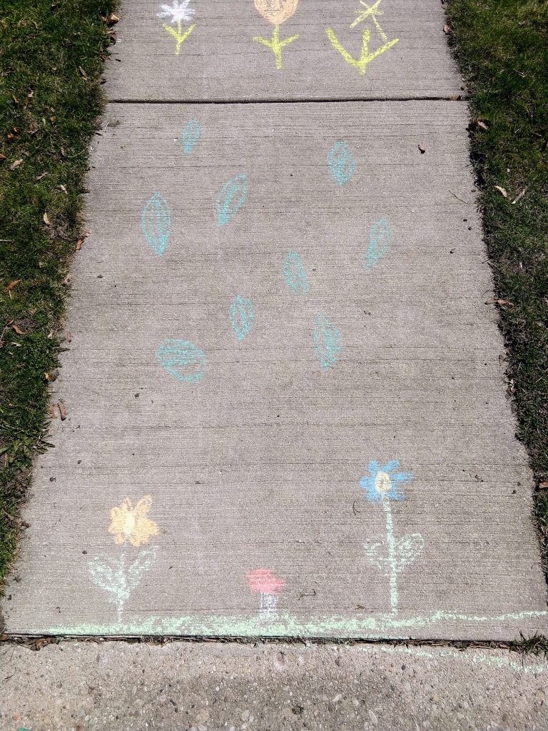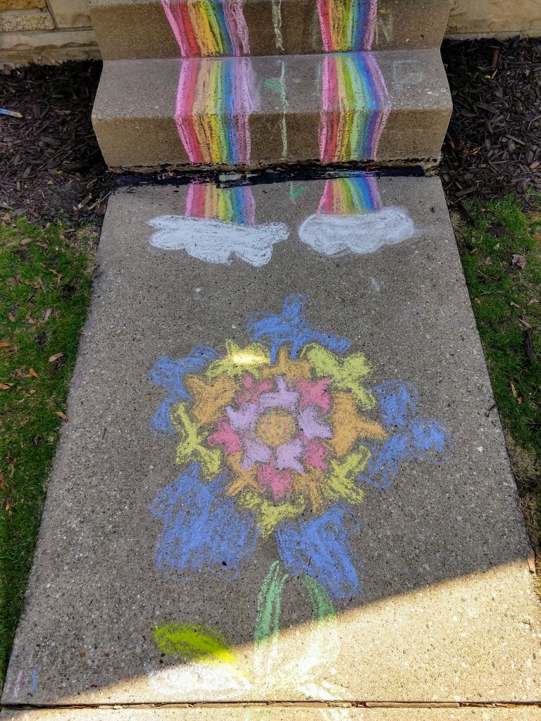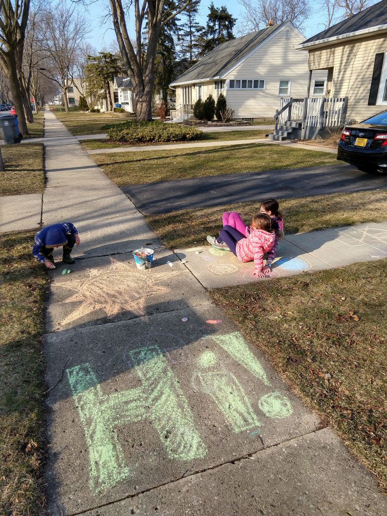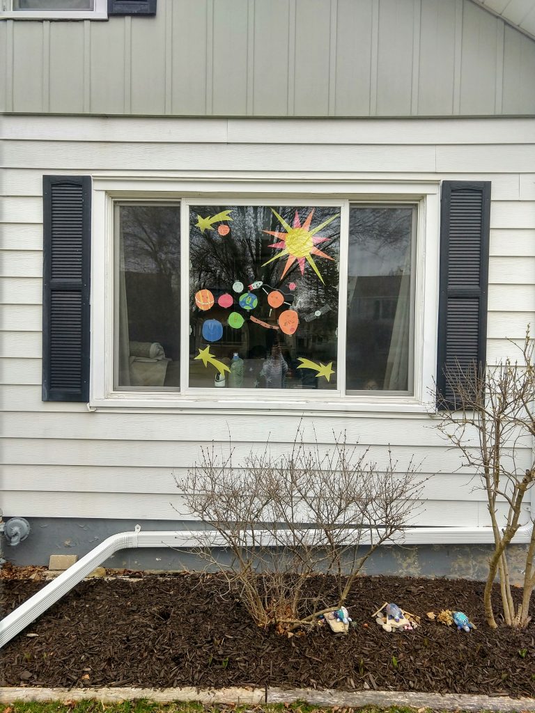It was the nicest weather day yet, so at 9:00 I took all 5 for a nice long walk. The boys were all chasing each other and crashing through the house, Ryan was trying to work, and I was about to lose my mind, so out the door we went. It was great! We found as much window/door art as we could, played sidewalk chalk games, walked over to our good friends’ house (they gave us foam balls for the kids and wine for me – they are THE BEST!!!), walked by and said hello to school, then walked home our normal school route for some familiarity.