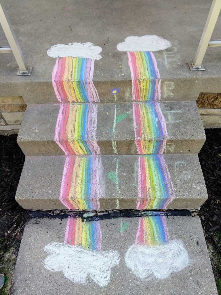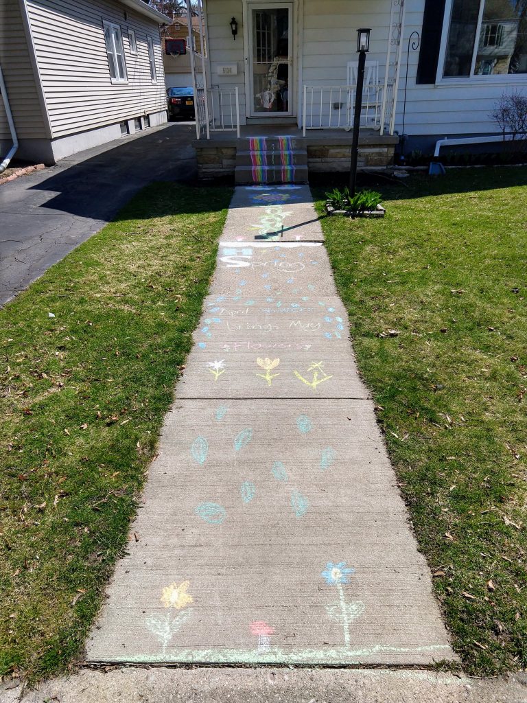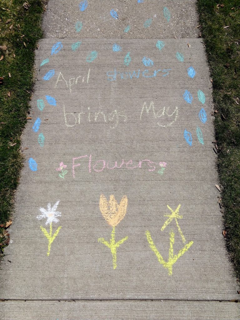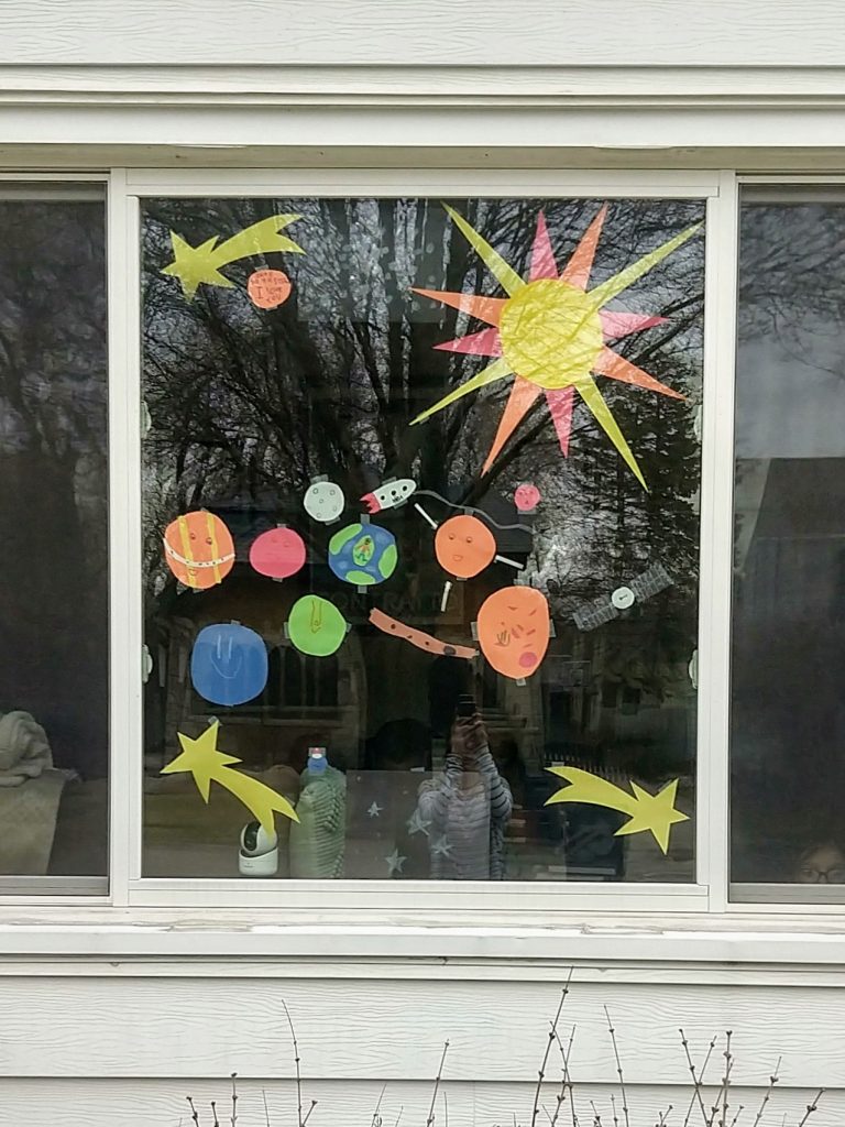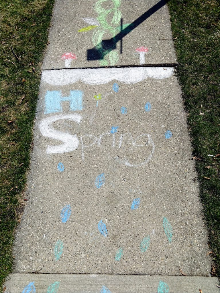 It was the nicest weather day yet, so at 9:00 I took all 5 for a nice long walk. The boys were all chasing each other and crashing through the house, Ryan was trying to work, and I was about to lose my mind, so out the door we went. It was great! We found as much window/door art as we could, played sidewalk chalk games, walked over to our good friends’ house (they gave us foam balls for the kids and wine for me – they are THE BEST!!!), walked by and said hello to school, then walked home our normal school route for some familiarity.
