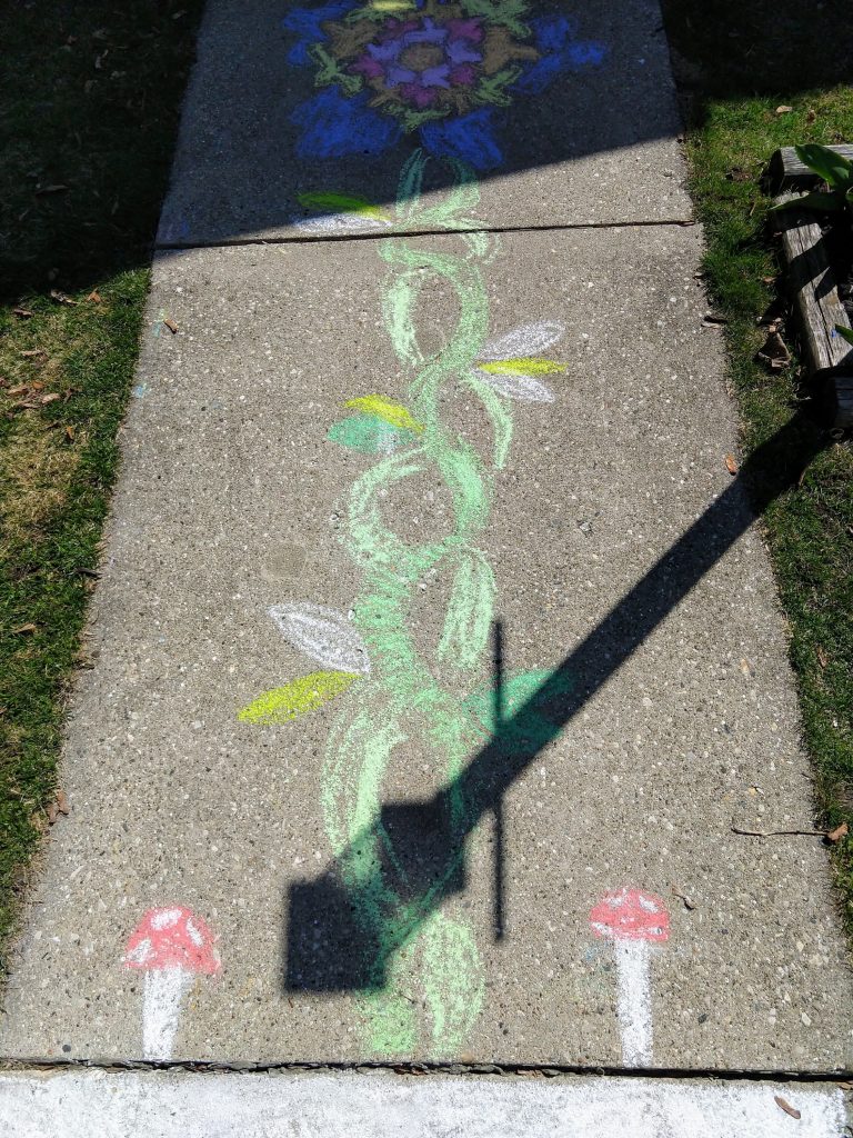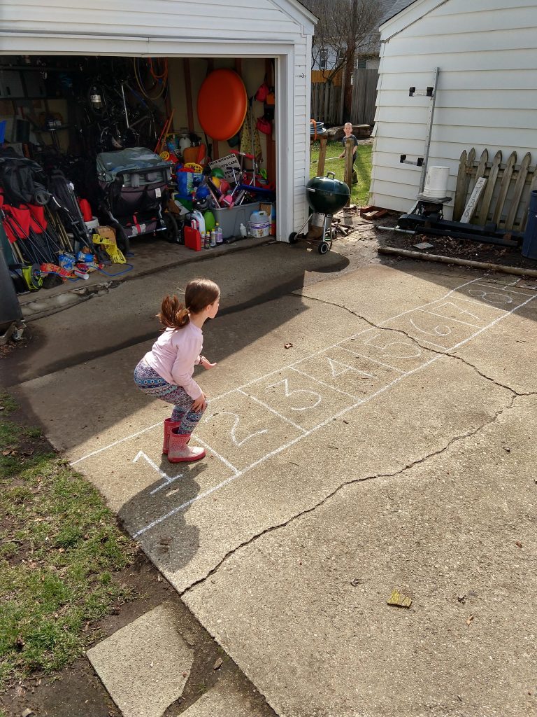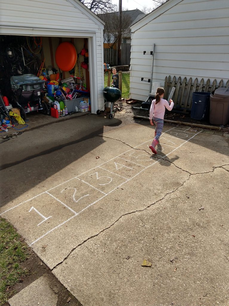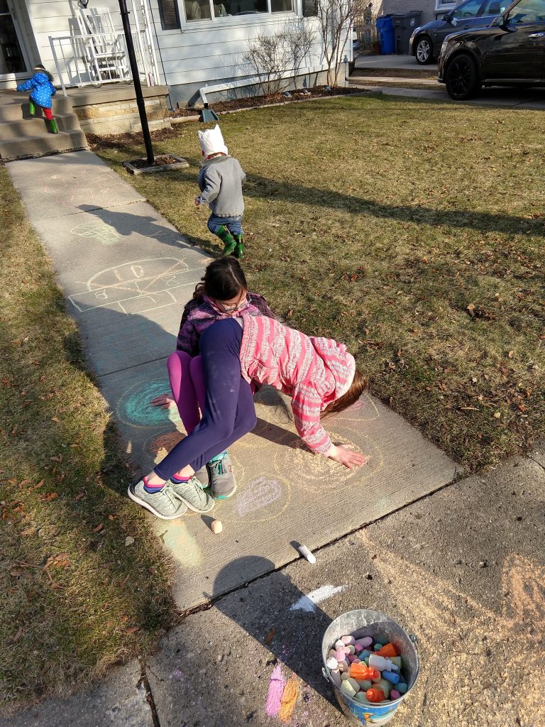 Pre-dinner outside play with sidewalk chalk – hopscotch and Twister