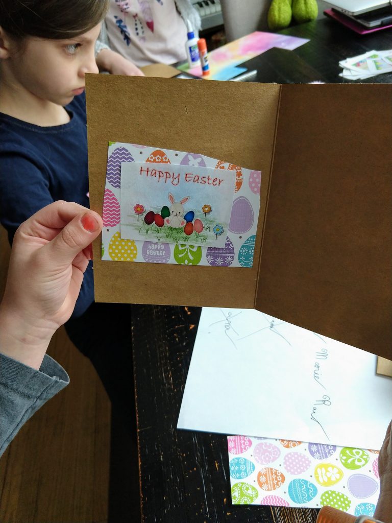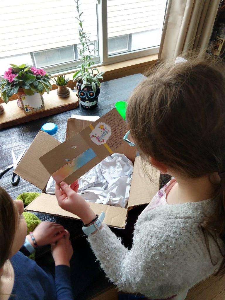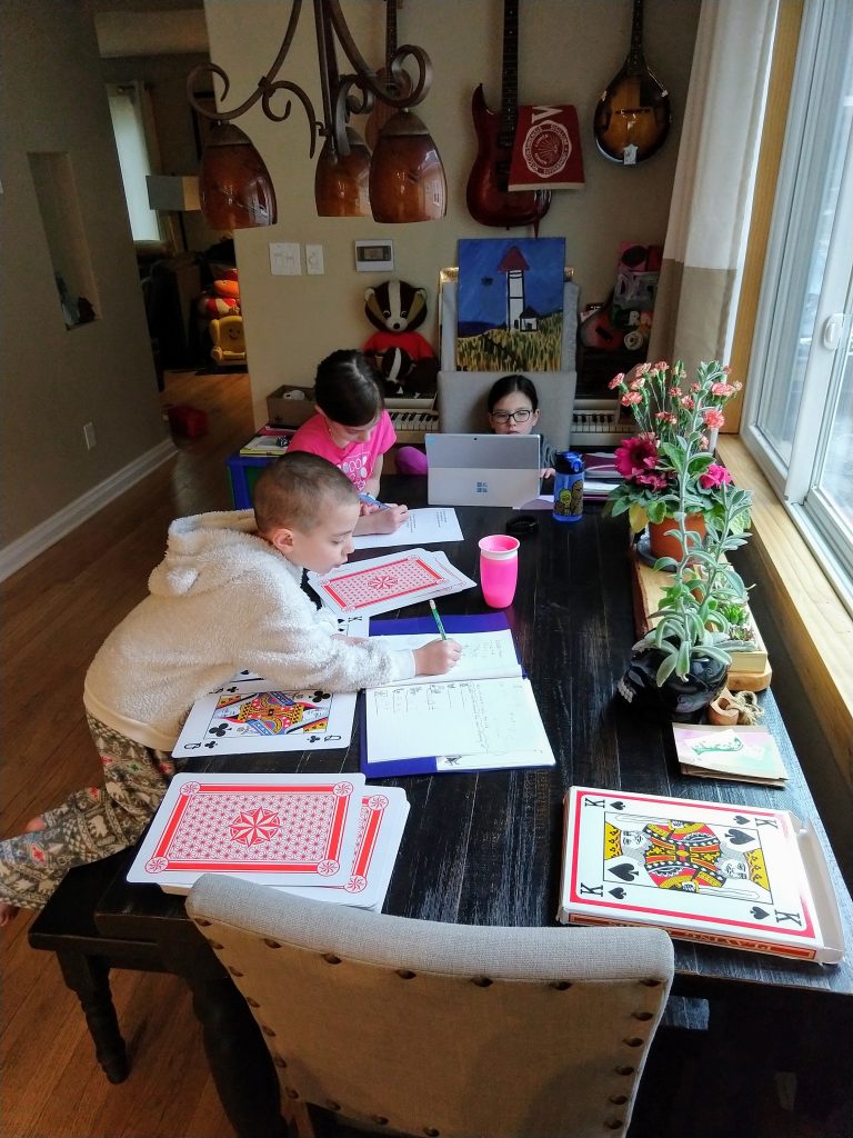 Math and writing – giant cards addition for M, math packet from school for L, book report and virtual pen pals with friends from school for D
