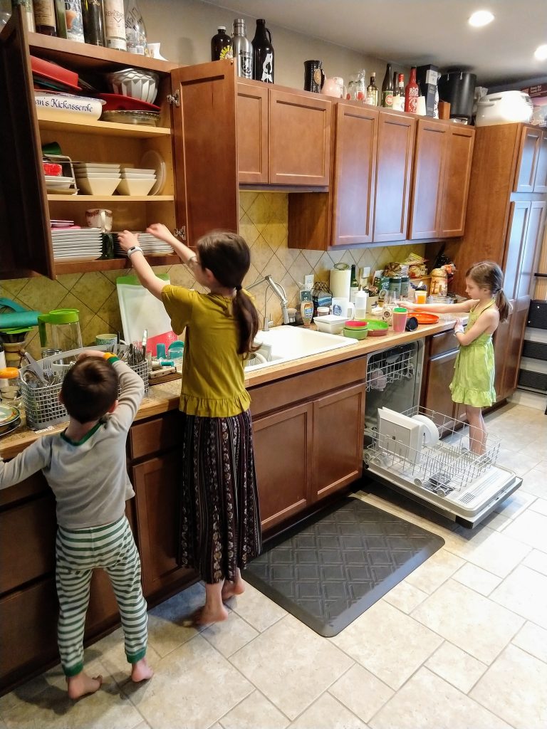 Morning math class – identifying and sorting the clean dishes out of the dishwasher by shape, counting the number of each type of silverware. Also saves me a chore! 藍