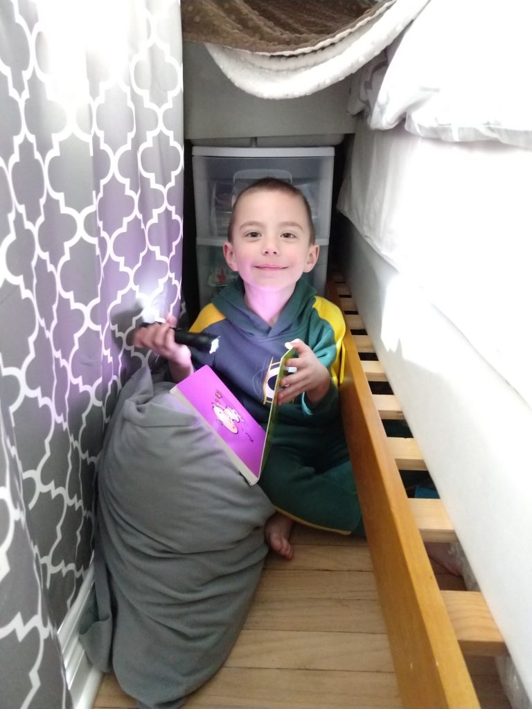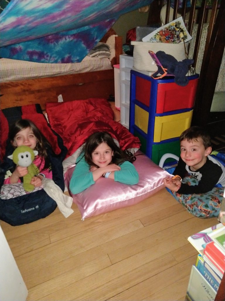 Indoor camping for the big 3, complete with “clouds,” campfire setups, and story telling as soon as I left the room 殺