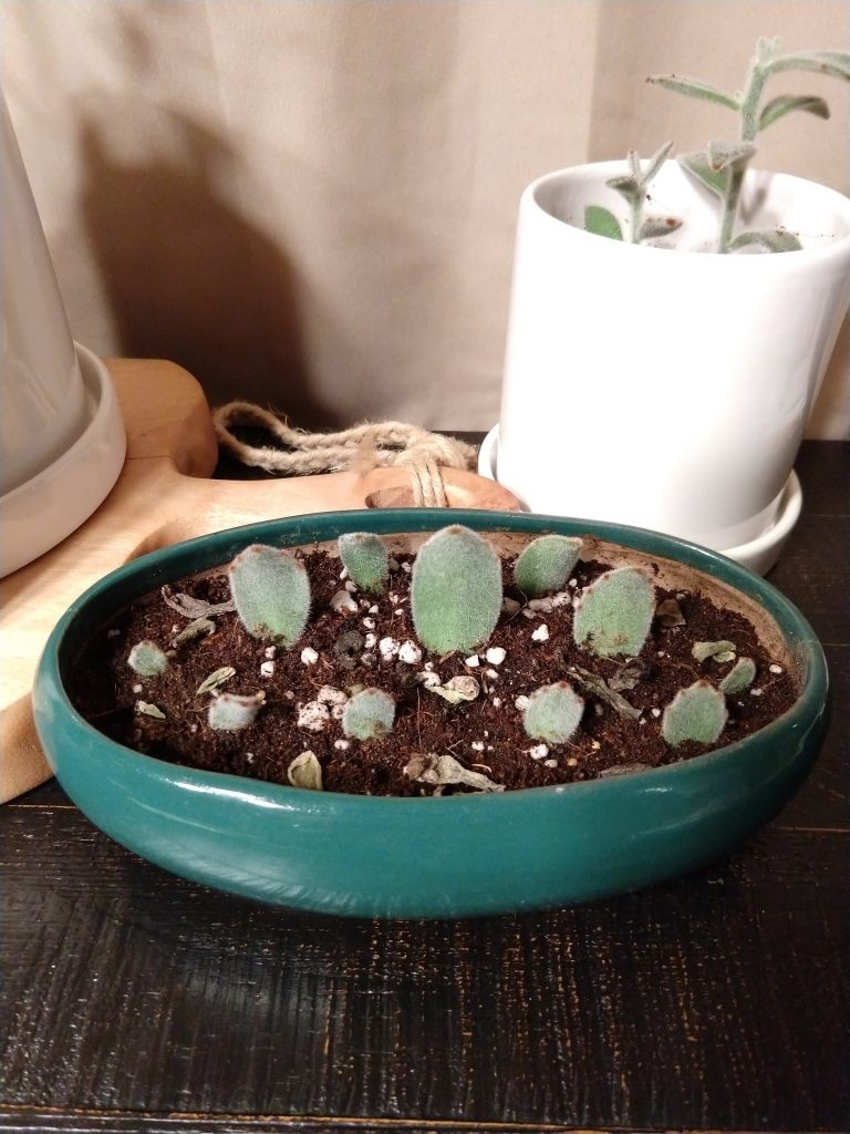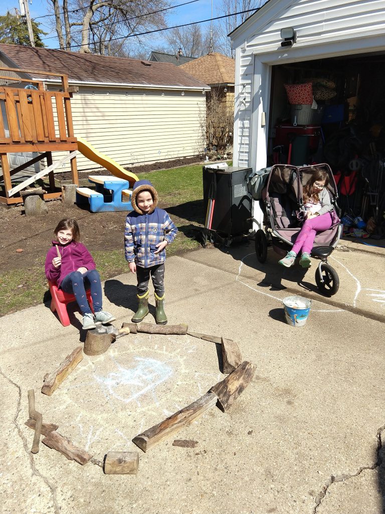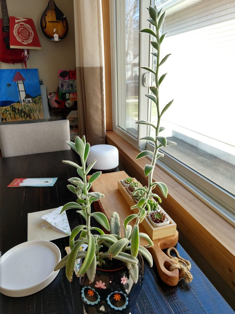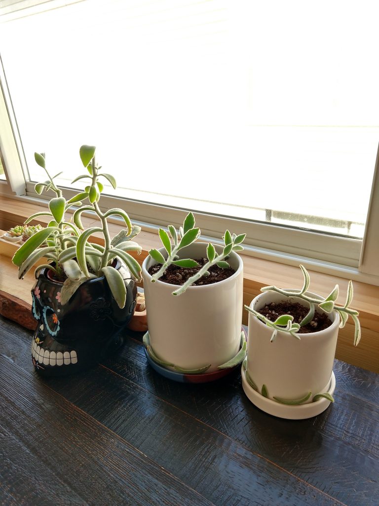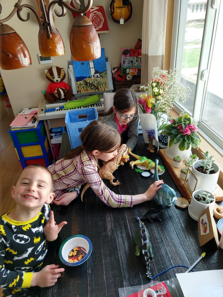 P.E. for the big 3 – go outside and play for as long as the sun is out. M created a “territory.” I started transplanting my dining room table garden into new pots and propagating a fuzzy panda succulent that had gotten huge!