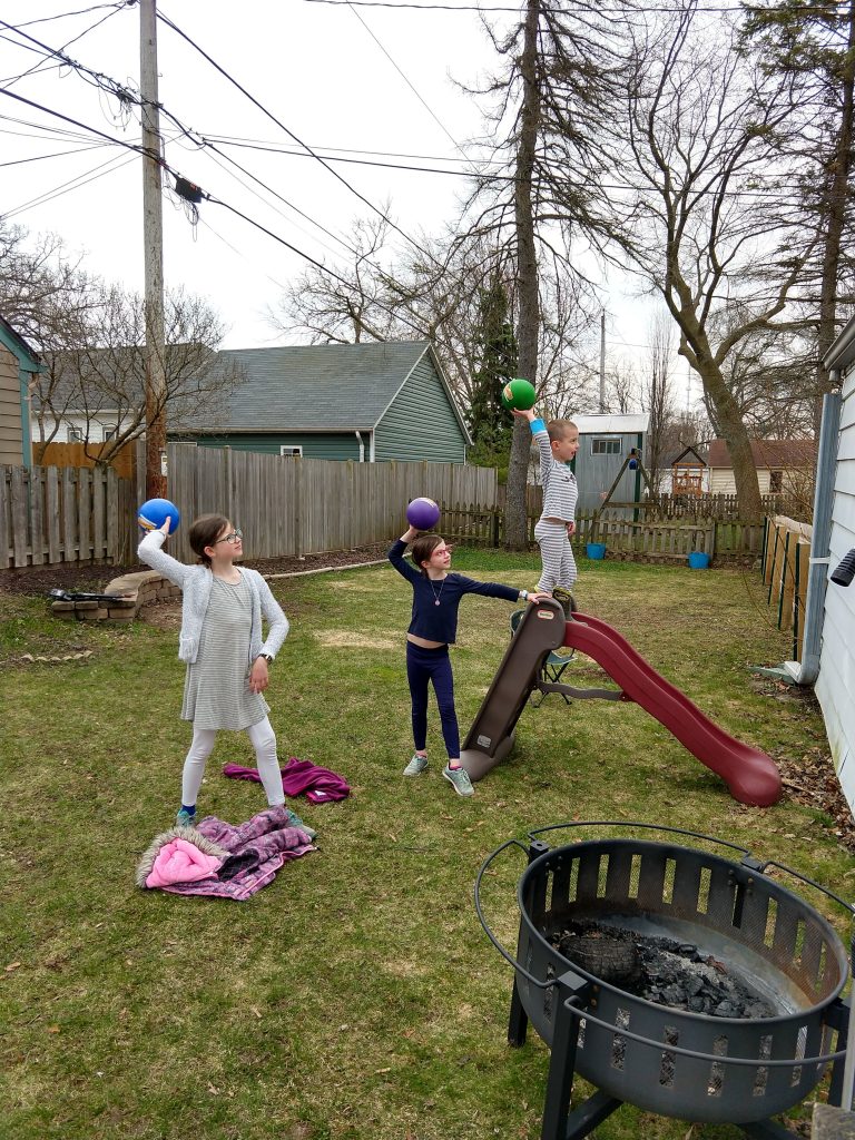 Next week begins our virtual learning for the big 3 through school, so this week will be lighter on the lessons. They’ve already started getting some practice lessons on their respective classroom platforms a couple times a week, so that’s good enough for me. I’m going to have them playing outside a lot this week in preparation for a couple solid hours a day of school work starting Monday. Our good friend Mr. Hand gave them a bag of foam balls last week, so they’ve all been having a blast playing with those outside for P.E. classes.