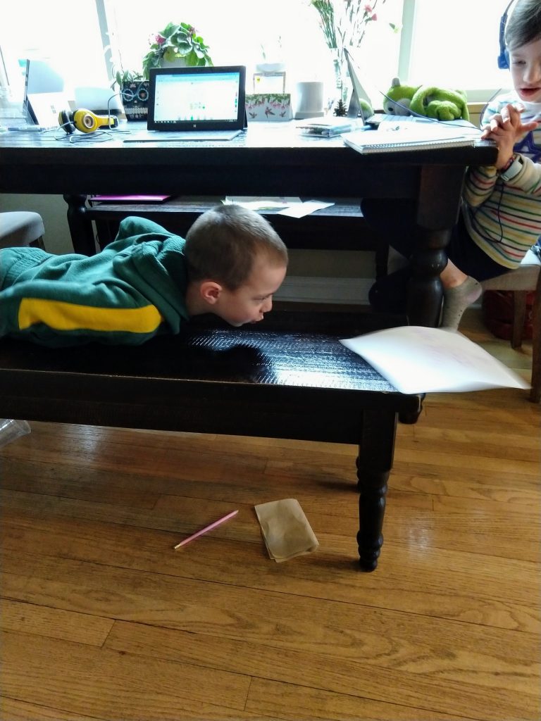 I know it’s only day 2 of VLT, but it’s going great for us so far. Yes, it’s difficult to keep the twins out of our hair while I’m trying to help all 3 at the table command center all morning, each on their own computer with their own set of lessons and own amount of time it takes to finish them all, but I’m doing it. I’m not only being especially mindful to be more patient with the kids but also with myself. This is so different than regular life for all of us, I just have to keep reminding myself that they all have weird feelings about this, too, that they can’t always communicate. That’s my job – to realize that, figure it out, and help them through, without it seeming too different than any other day. Smooth waters.