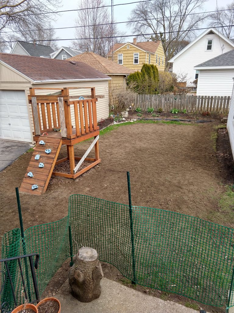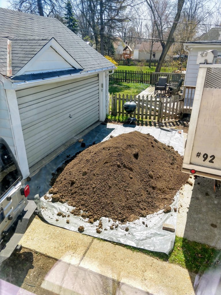 Backyard reno got underway, and I cannot wait until we have a regular, grass-covered yard again. I’ve been planning out my cocktail seating area for a couple summers now. I got done what you see in these pictures, then Ryan worked a bunch more after me – added more dirt to that back area, dug out a bunch of small roots still left from when we took down the tree last summer, leveled around the tree area, wheeled in more dirt for the tree area. Hopefully we’ll actually get that mound fully moved into the yard before the weekend.