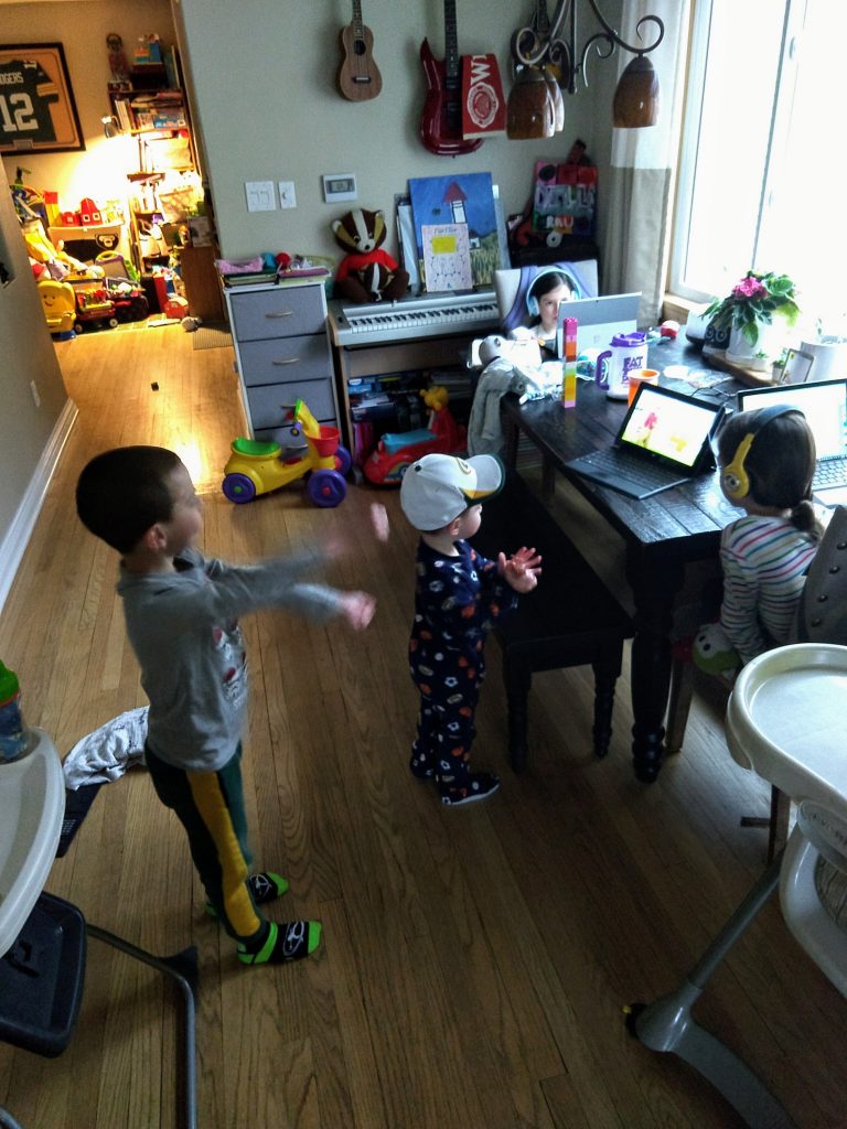 3-way Temple Run challenge on their tablets for the big 3 while the babies napped and I showered, but Avit decided he didn’t want to nap today after falling asleep in the stroller earlier. Booger