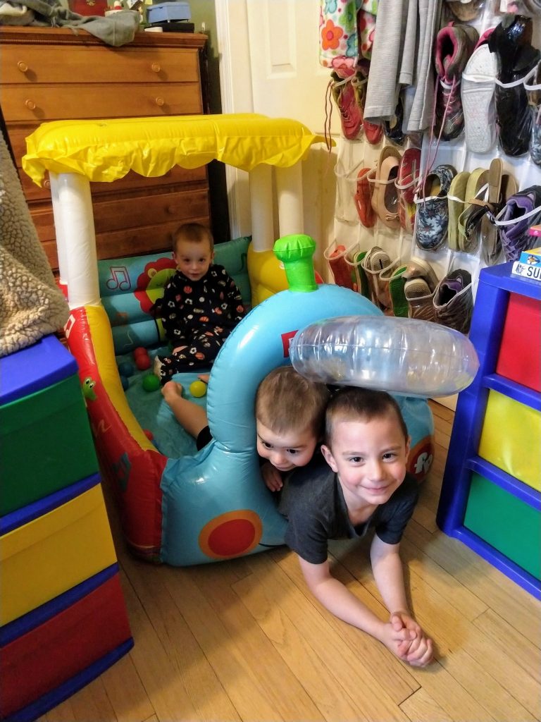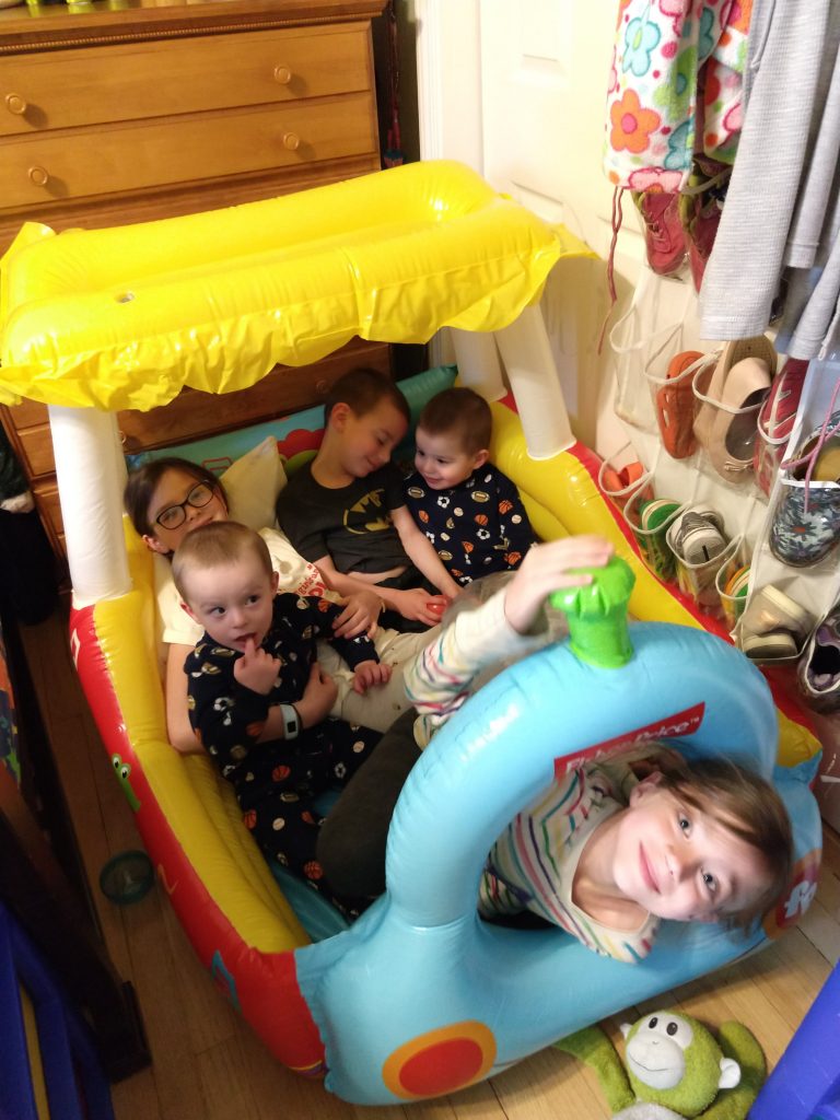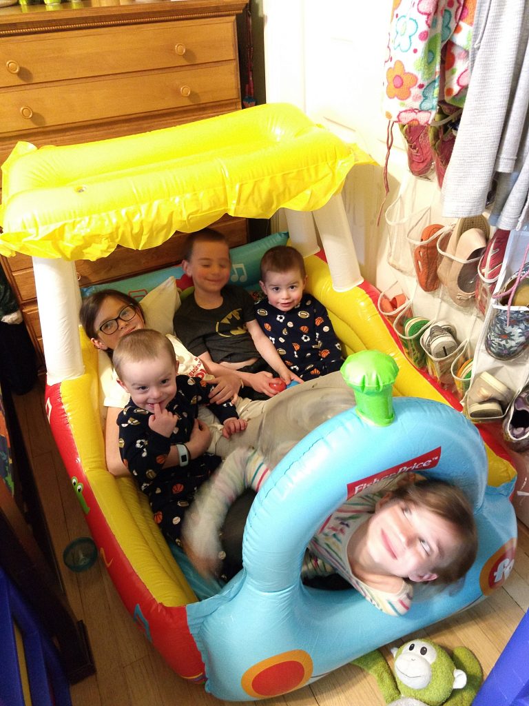 Today was something special with the boys, so just before lunch I blew up a new choo-choo train ball pit Ryan got the other day. All 5 absolutely loved it, of course, and they started playing “rain” with the balls on top of the pit. It was great! Then, by the end of the day after naps, the boys couldn’t handle it anymore without a particular level of crazy, so Ryan deflated it. Ah well, fun while it lasted. Poor Morrison has been so stir crazy without being able to play outside with all the rainy weather we’re having, and he keeps getting in trouble for not listening. I feel horrible and try to be as gentle as possible because I know he’s more emotional right now than the girls, but man oh man.