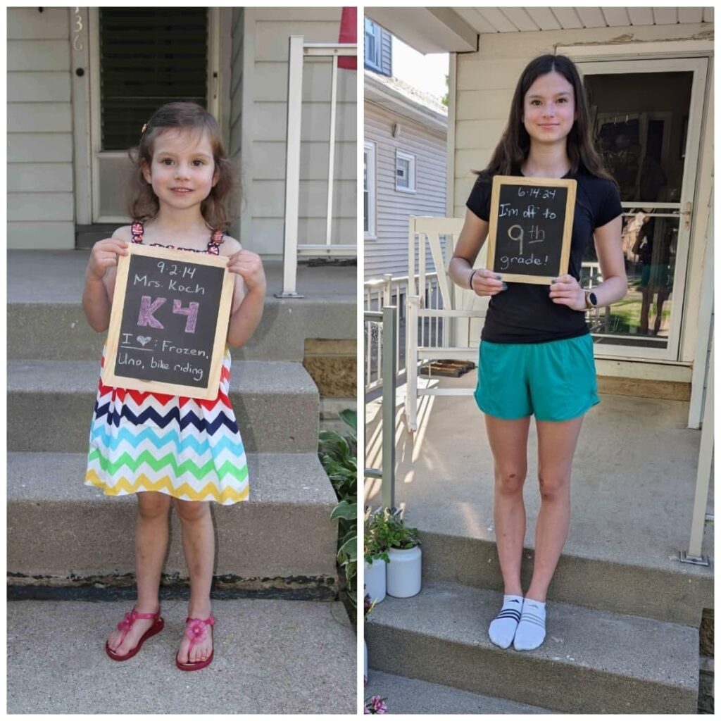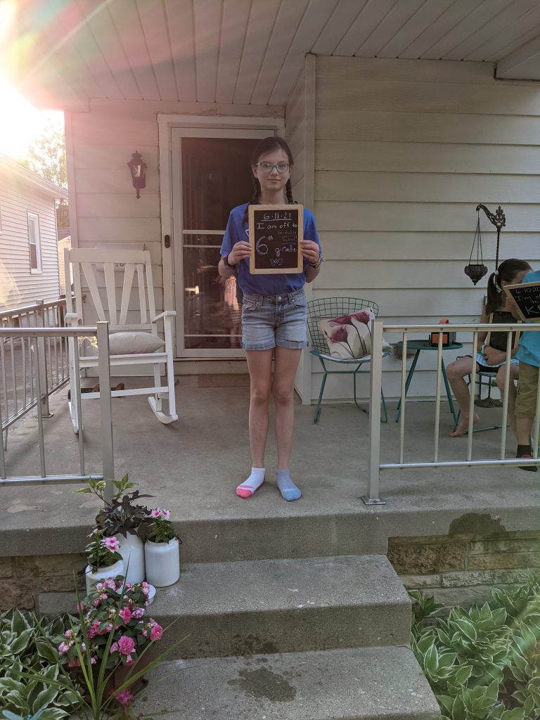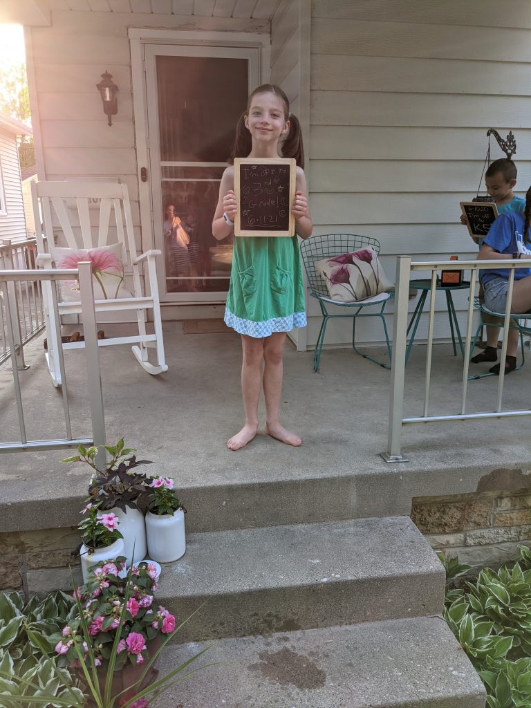 For all the “grown-upness,” though, she still loves to be silly. Making faces, picking on her siblings, having summer or weekend sleepovers with the twins, burping the alphabet, showing me all of her purchases and product unboxings. She tried to get a summer job this year, but that didn’t pan out. She did do some mowing for one of the neighbors a couple times, but it wasn’t quite the regular paycheck she was hoping for. We travel a lot during the summer, though, and she had lacrosse and cross country practices, so I’m not sure where she was planning to put that job. So not totally grown up quite yet… 😉 She also has a tiny strawberry plant that we got from a neighbor’s baby’s 1st birthday party this summer that she started from seed and has been taking meticulous care of – bringing it in during heavy rains, misting it with a spray bottle when it’s dry. Still the caring peanut she’s always been.