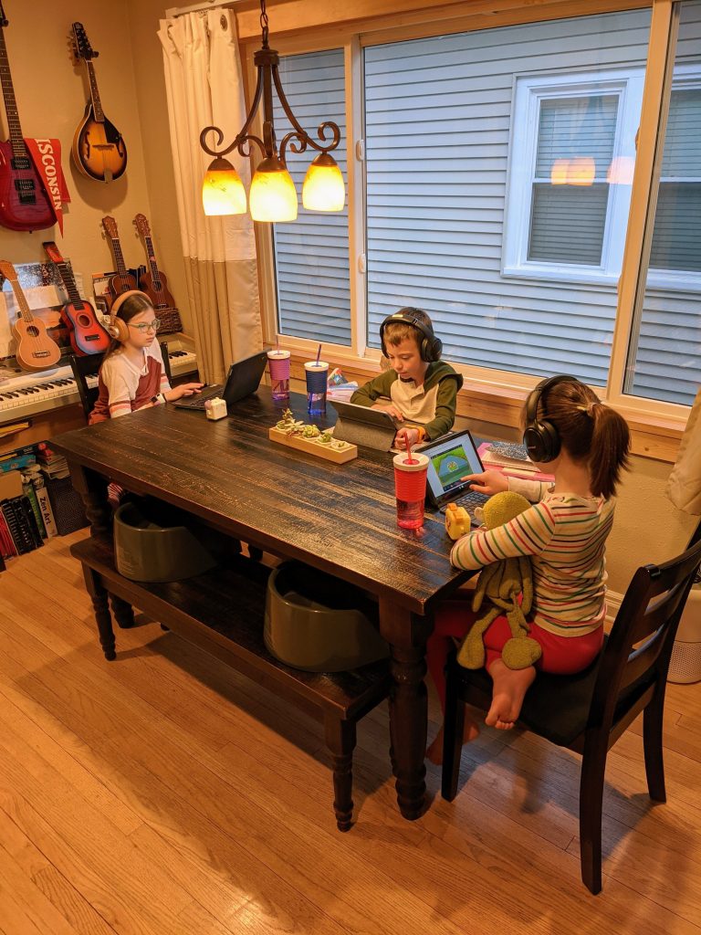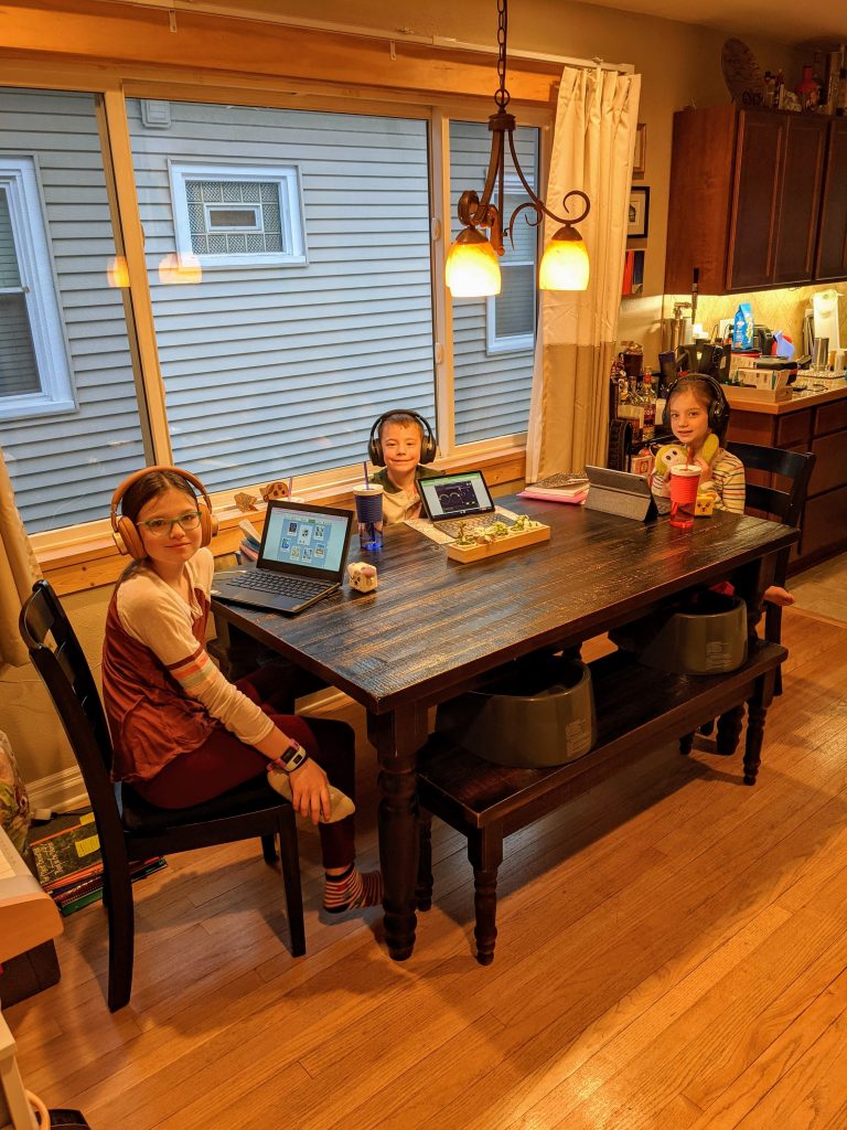 As you know, when school started again in September we chose to keep the big 3 fully virtual. With the success they’d had at home last spring and the complete uncertainty of how everything was going to play out with in-person schooling and the spread of covid-19, we felt it was right for us. Fortunately it’s worked out great so far, with each grade having enough students choose fully virtual that each of their classes has a dedicated fully virtual teacher, not splitting her time between those students in class and those on screen. And again, that not having to get everyone out the door at a certain time each morning thing… I’ve gotten very used to it! We get to choose virtual/in person by quarter, and I think we’re going to stick with fully virtual all year. The kids all love their teachers, as do I; they’re doing an excellent job; and they haven’t missed a beat instruction-wise or socially.