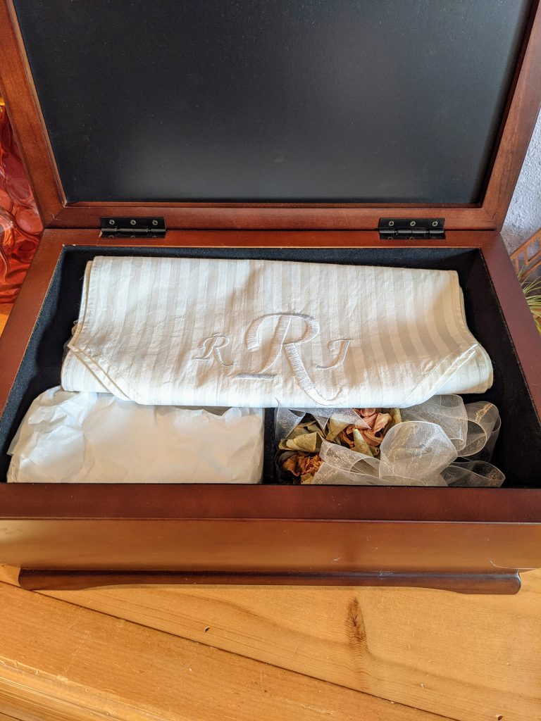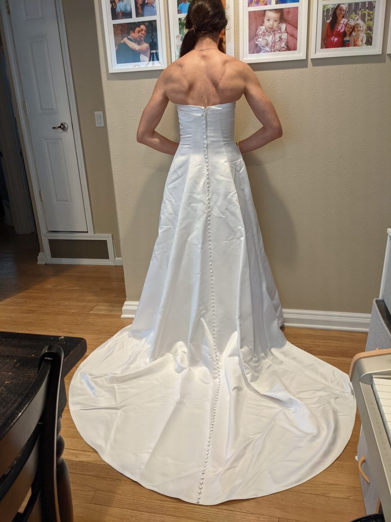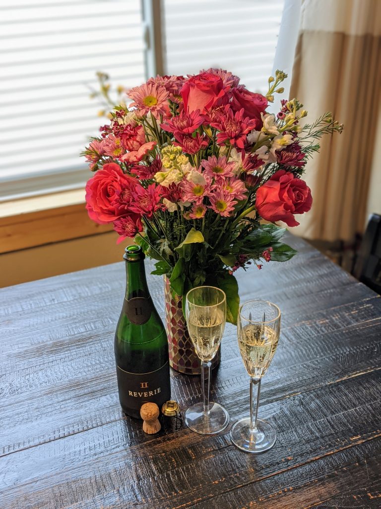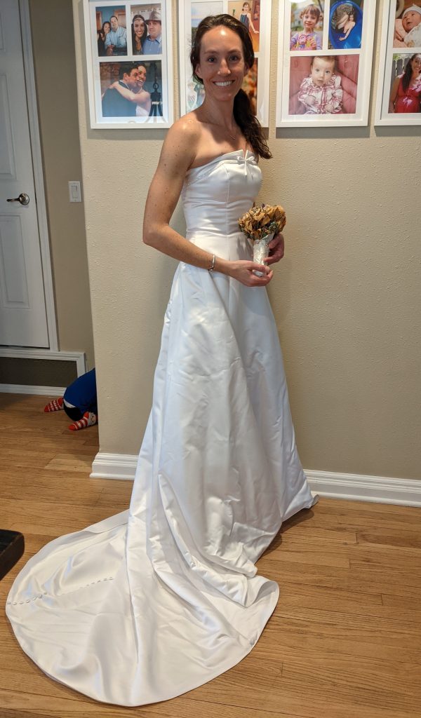 We didn’t have a big celebration for #15. Ryan sent me a beautiful flower arrangement, I hung up the decorations Lana had made for Valentine’s Day that we were saving for this, and I opened a nice bottle of sparkling wine before dinner. I put on my wedding dress, too, which Avit absolutely loved helping to arrange.
