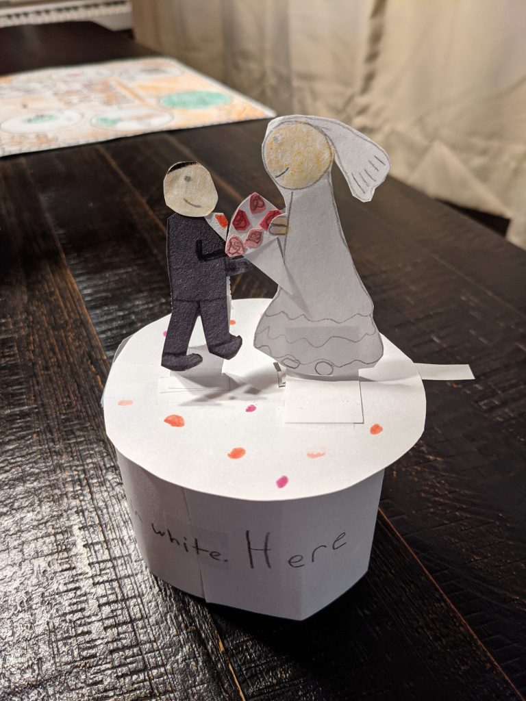 Lana’s anniversary present for us. She made it immediately when we got home from school and had me send a picture of it to her teacher. 🙂 It says “Here comes the bride all dressed in white.”
