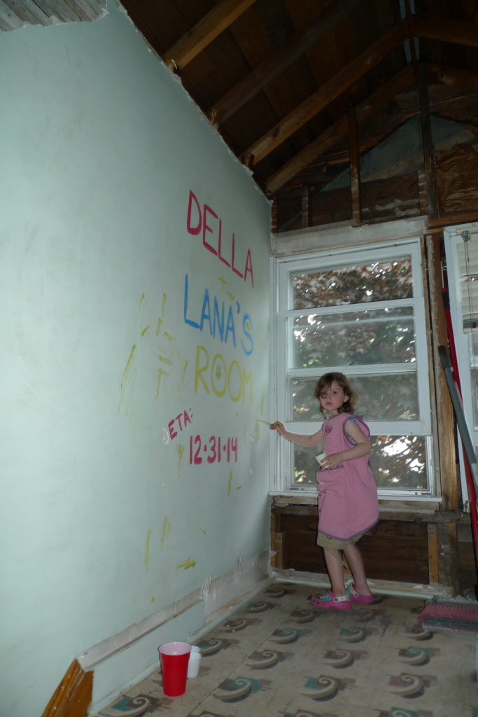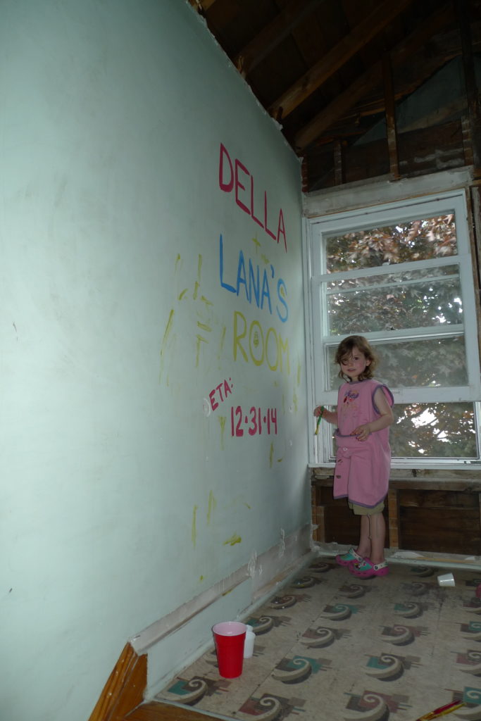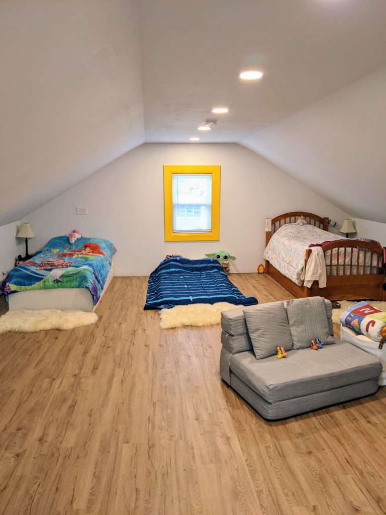 On December, 31, 2013, Ryan stood in the kitchen and promised me that 1 year from that date, we would have a finished room upstairs (we turned our attic into a giant bedroom for the kids). At the time, we only had Della and Lana, so it was going to be the girls’ bedroom, and the second downstairs bedroom would become a guest room/playroom. I even painted on the wall leading up the stairs to the attic “Della + Lana’s Room ETA: 12.31.14”