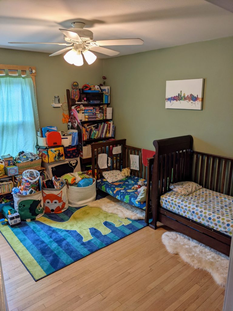 So the big 3 now have a gigantic bedroom upstairs (the bathroom will come much later), the twins have their own bedroom that is also a playroom, and there are no more cribs in our bedroom! All toys are out of the living room, and the house finally feels like our home again instead of a nursery/daycare/insane asylum. It was touch and go there for a bit. 😉